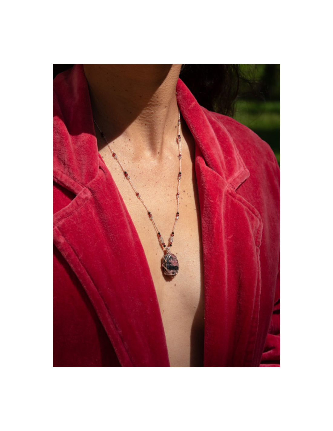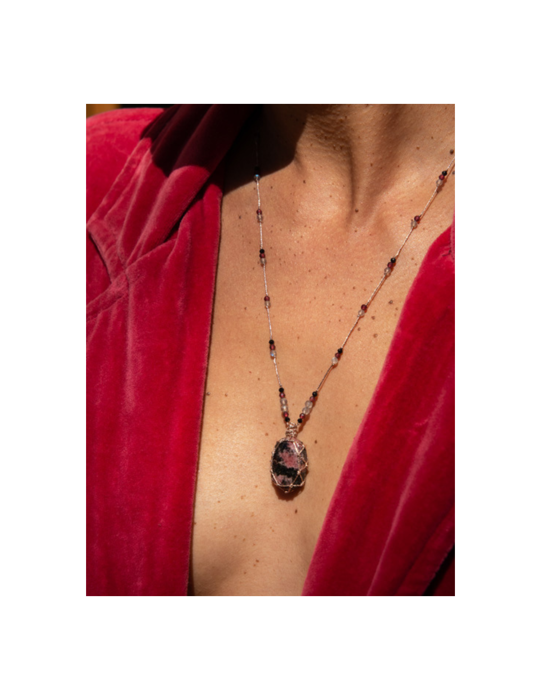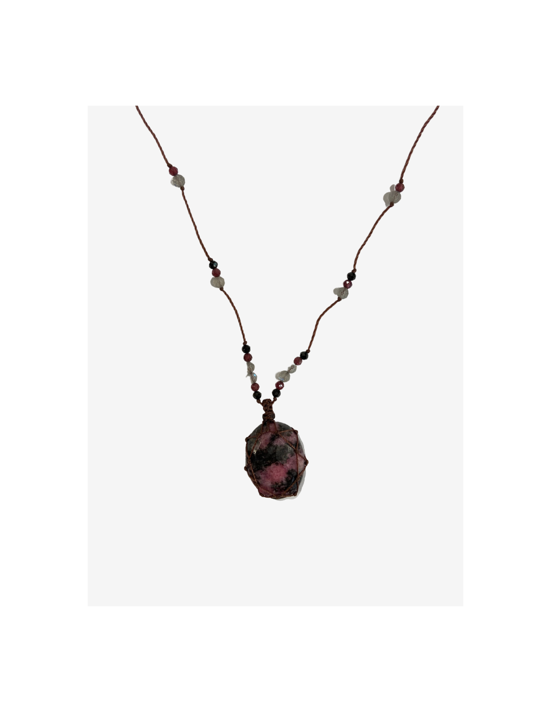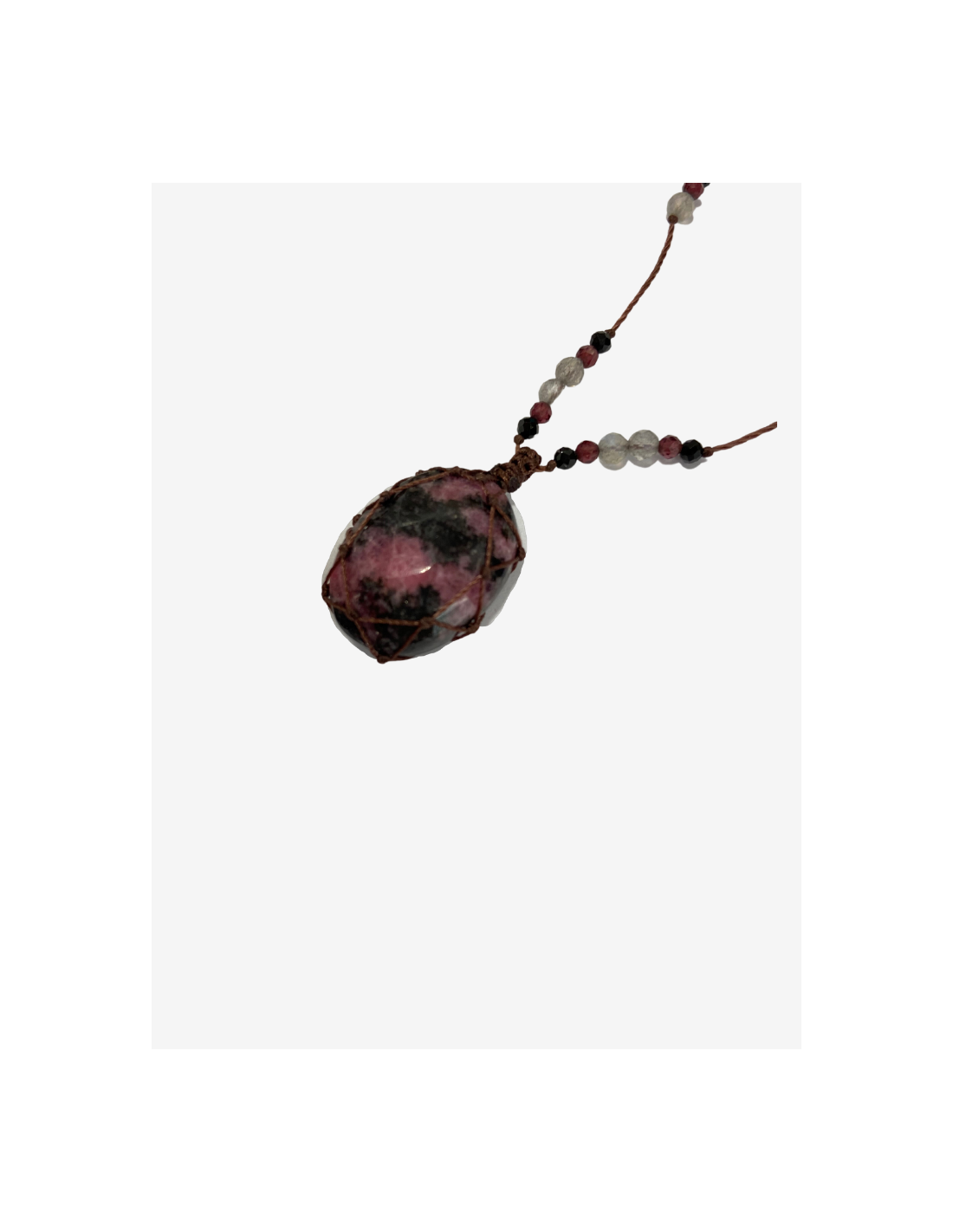 Le talisman est orné d’un cabochon de rhodonite. Il est ajustable de 20 à 35 cm grâce à son fermoir coulissant.