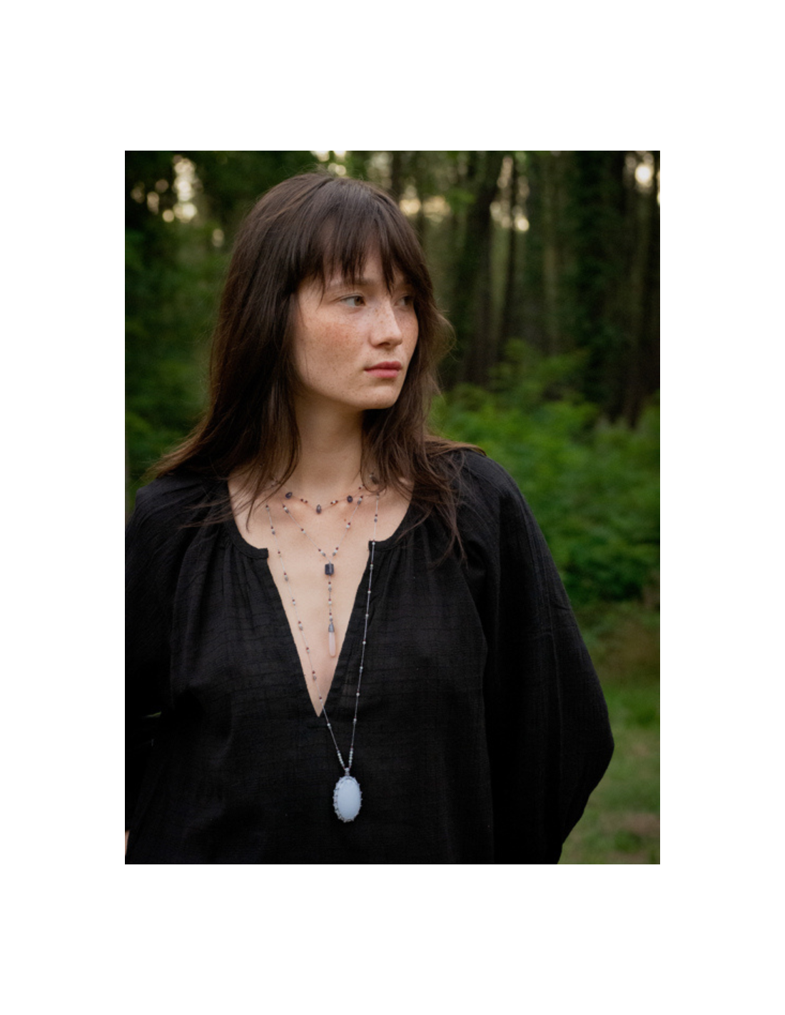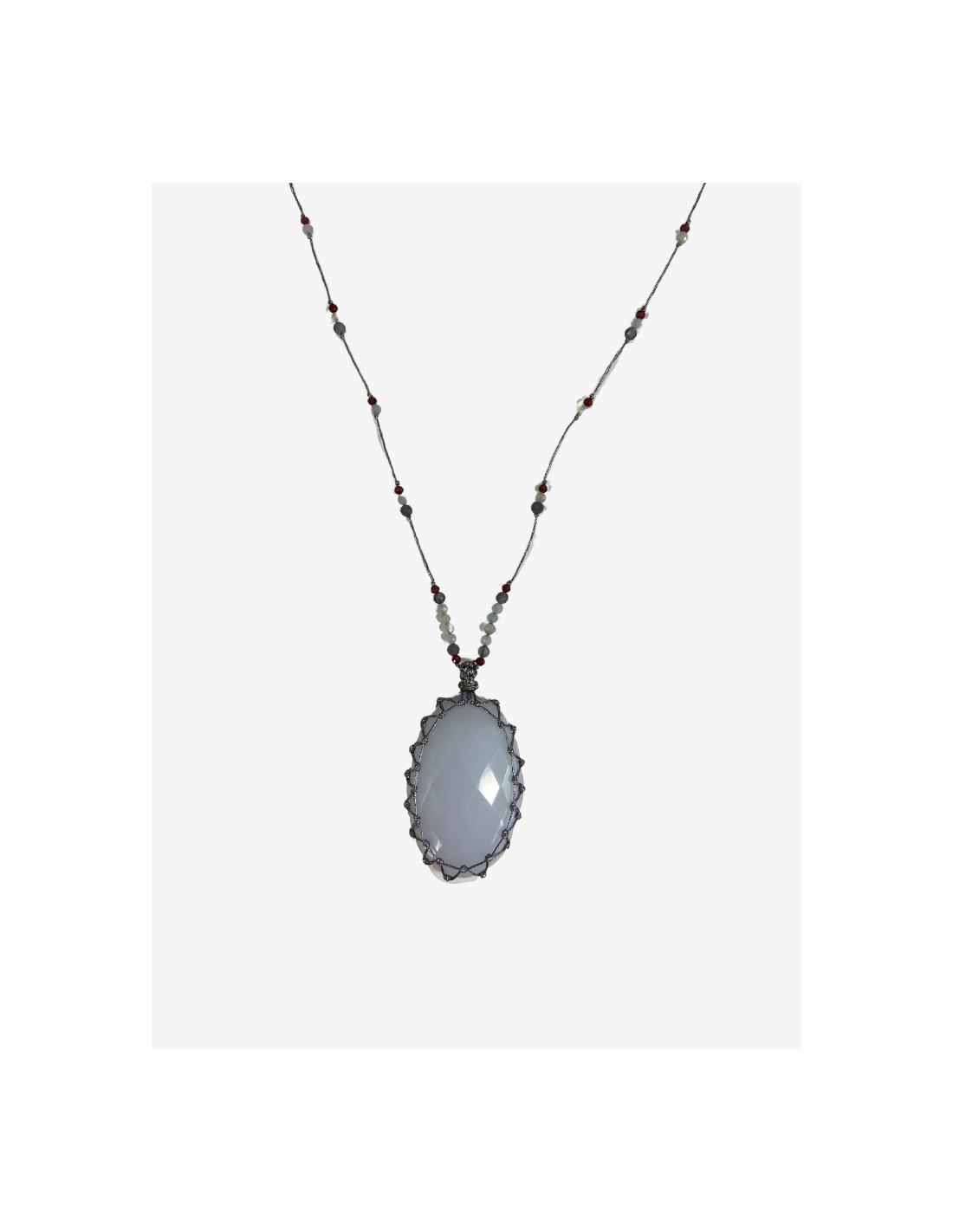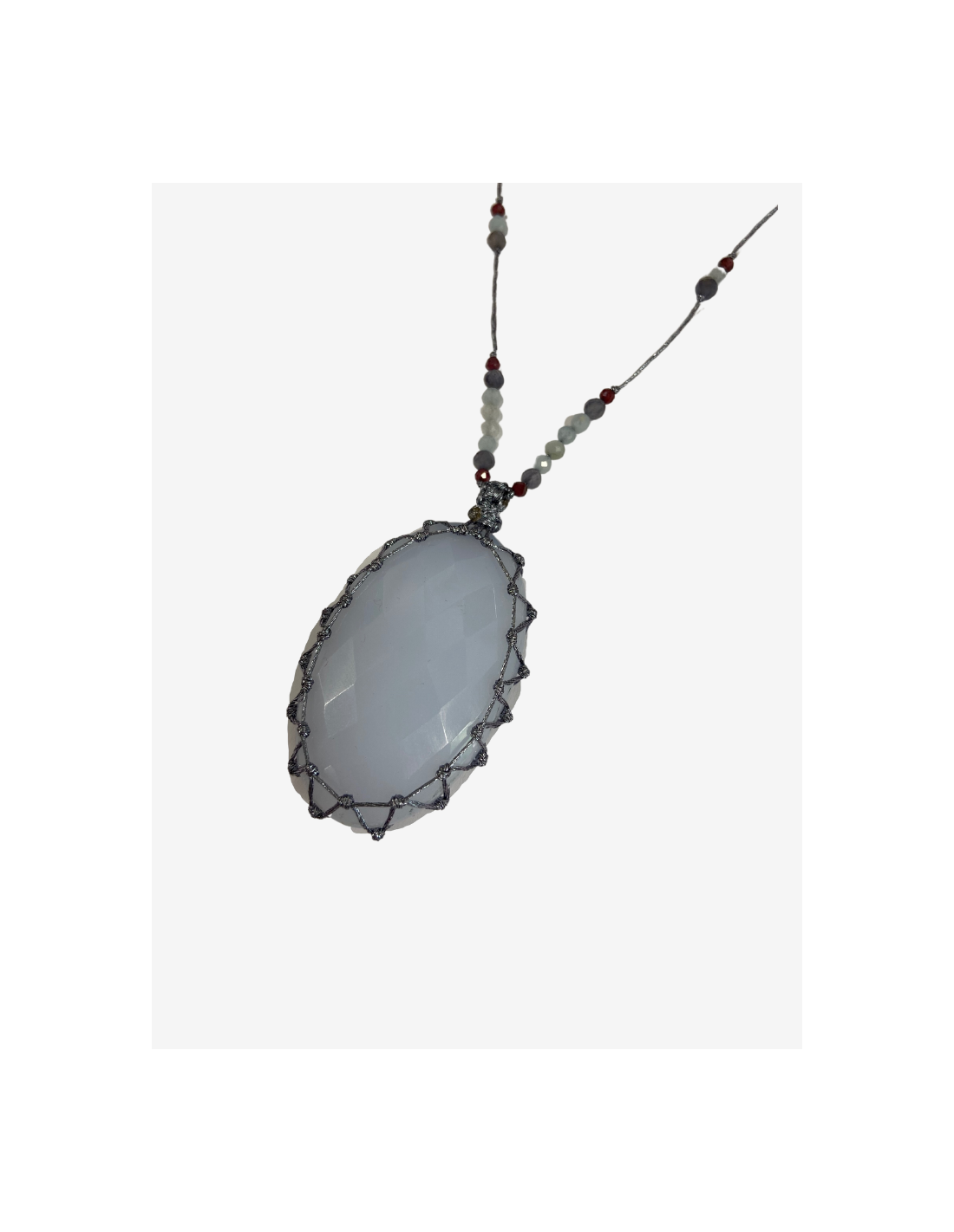 Le talisman est orné d’un cabochon de calcédoine. Il est ajustable de 35 à 52 cm grâce à son fermoir coulissant.
