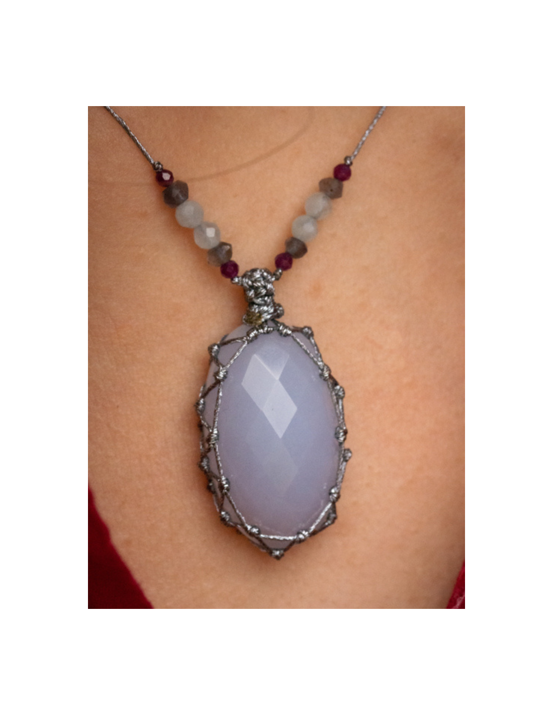 Le grand talisman LUCIE est composé de plusieurs pierres : zircon violet, iolite et calcédoine montés sur des fils métallisés de couleur argent .
