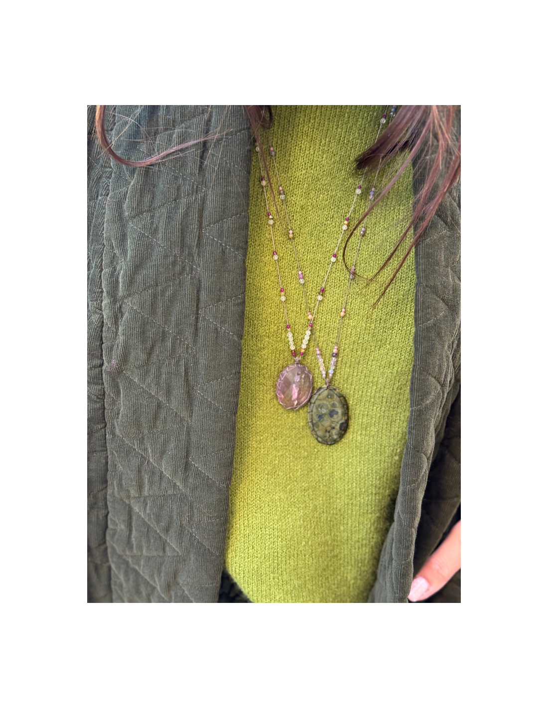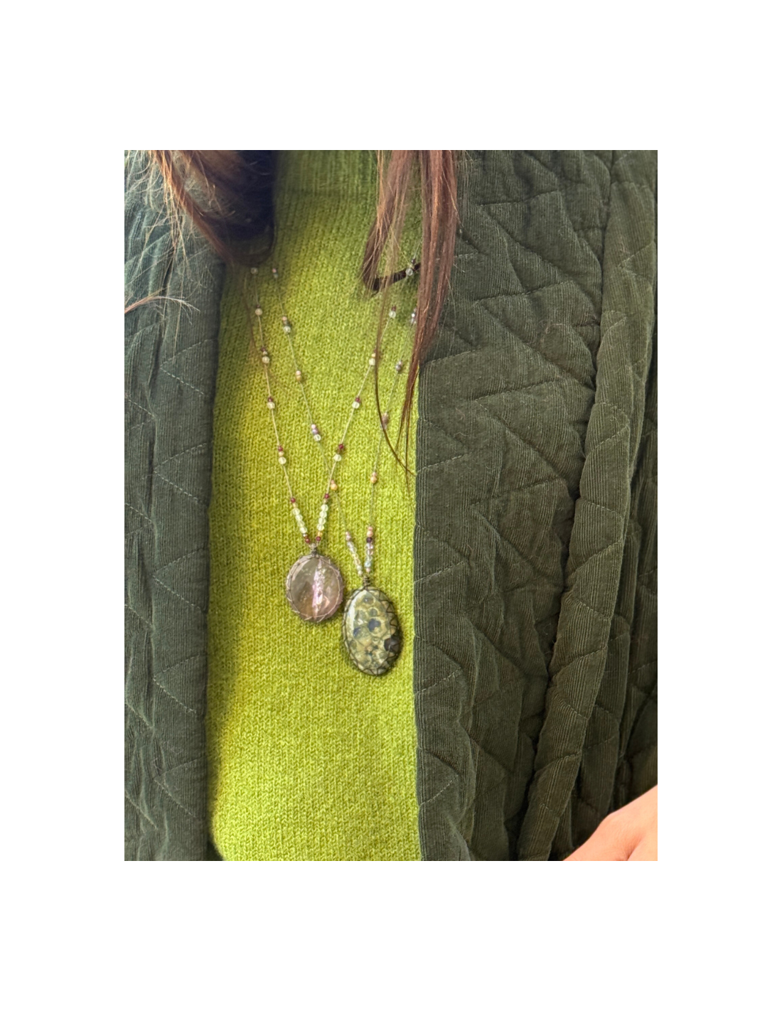 Le petit talisman CAPRI est composé de plusieurs pierres : préhnite, zircon cassis et opale verte. Elles sont montées sur des fils kaki