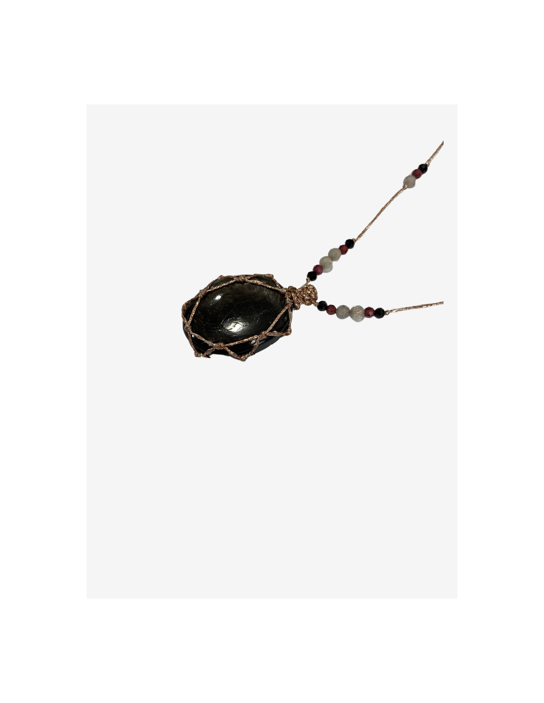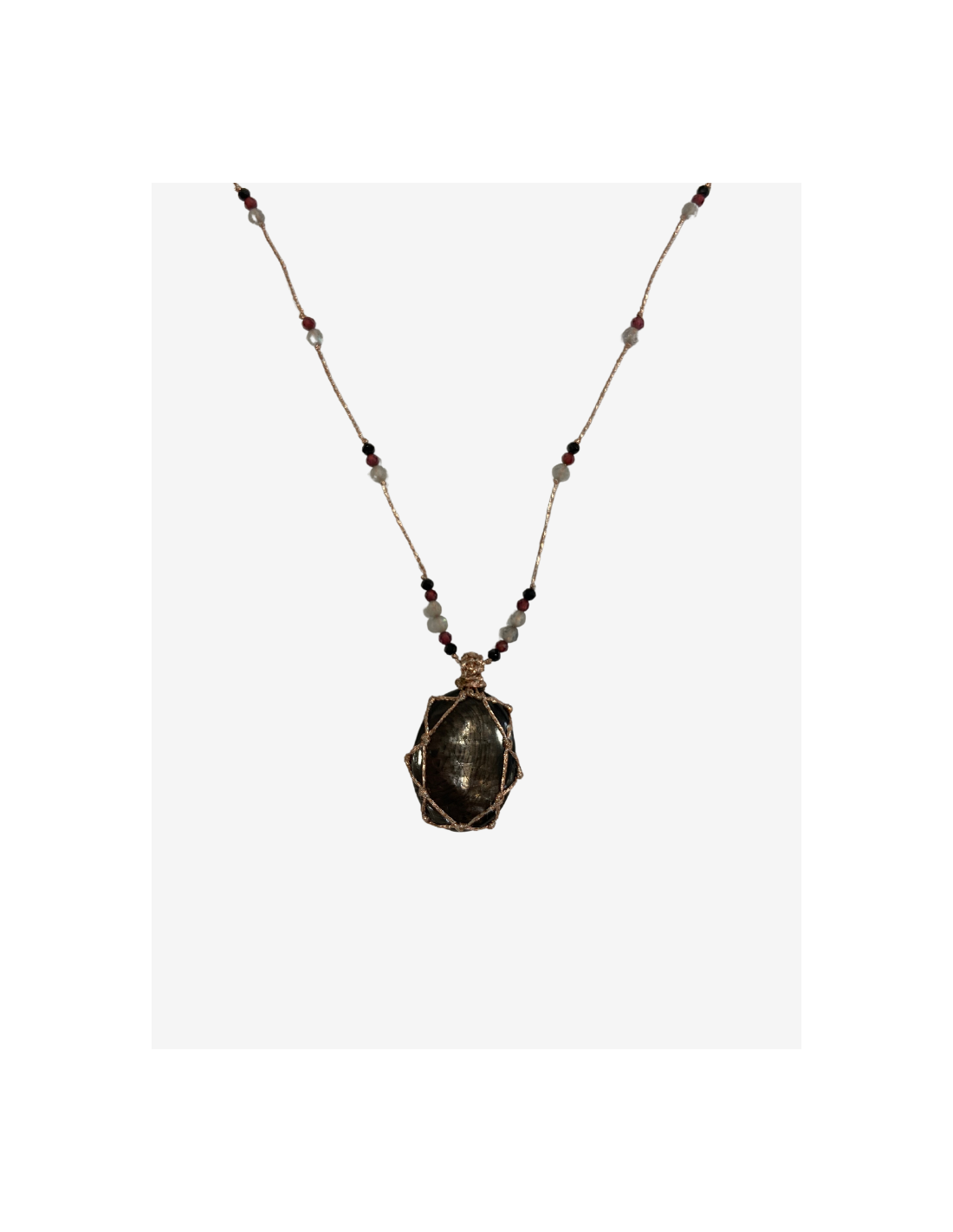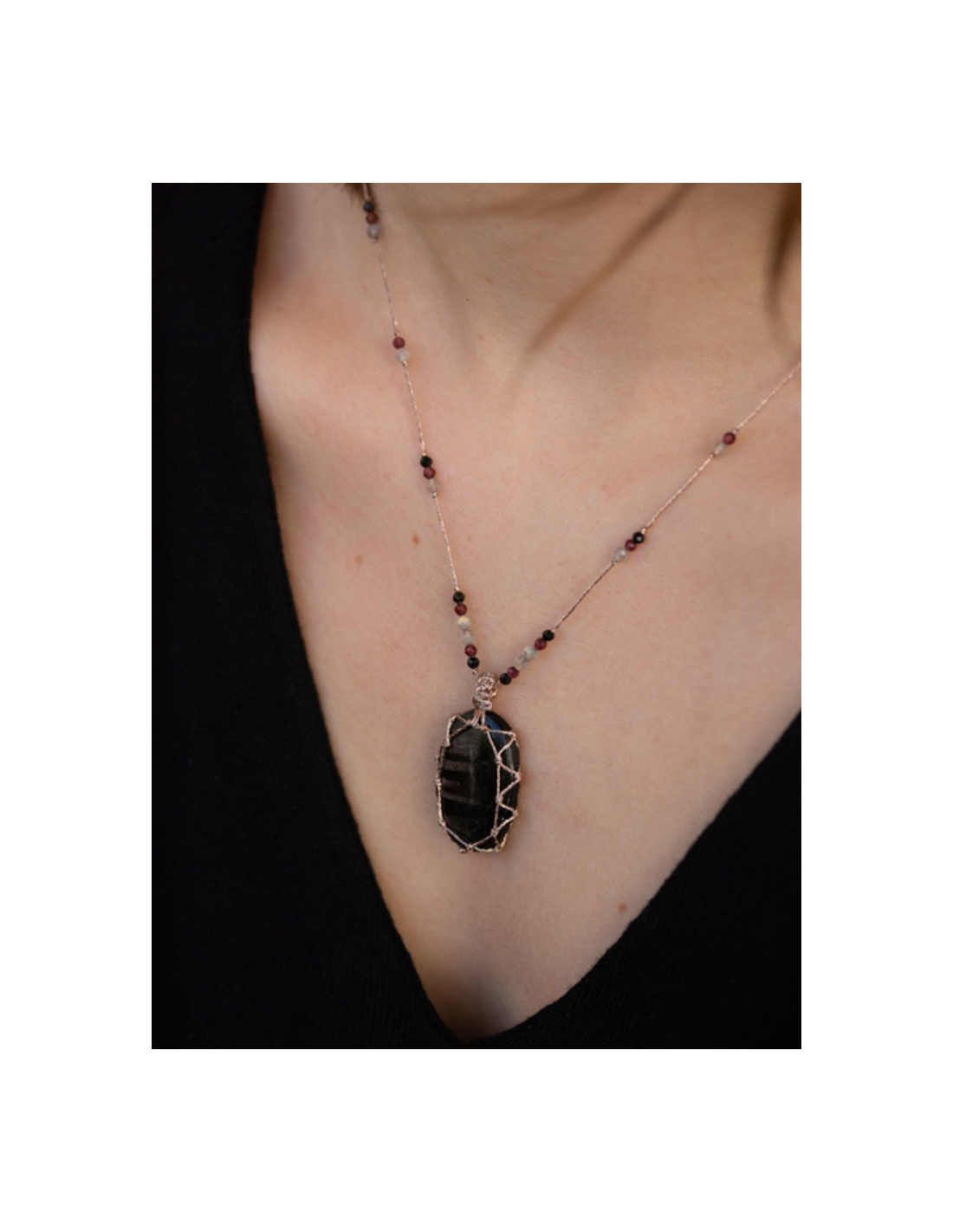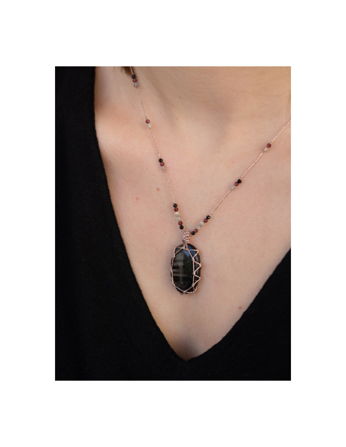 Le petit talisman LAZ est composé de plusieurs pierres : grenat, labradorite et onyx noir montés sur des fils métallisés de couleur or rose.