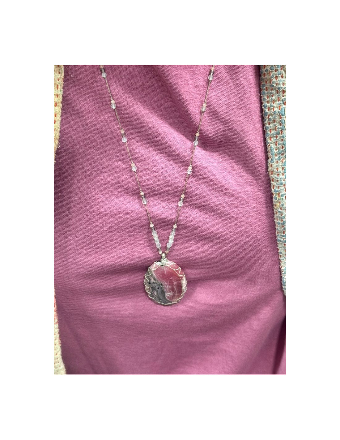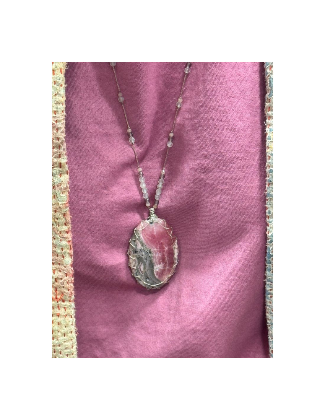Le talisman est orné d’un cabochon de rhodochrosite. Il est ajustable de 35 à 52 cm grâce à son fermoir coulissant.