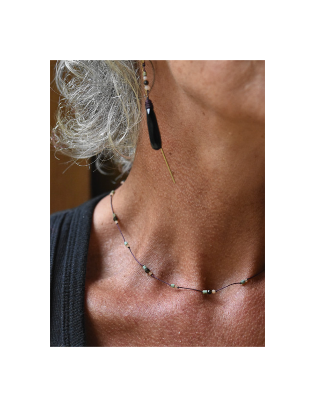 Le collier ras de cou UPI est en pierres fines et fils de soie. Il est composé de différentes pierres : pierre de lune, turquoise afghane et oeil de chat montés sur des fils de couleur prune. Sa longueur est de 46 cm.
