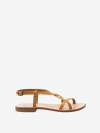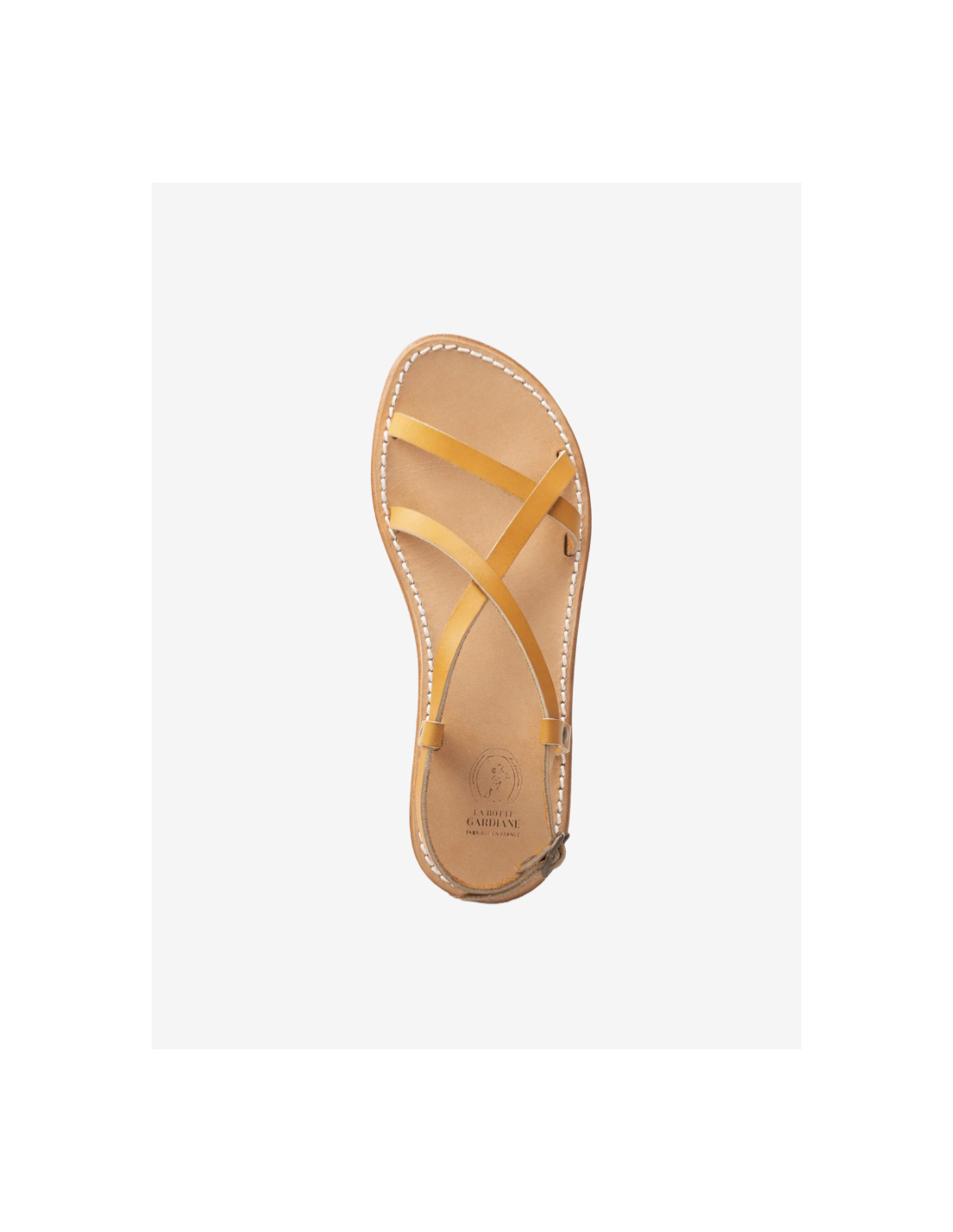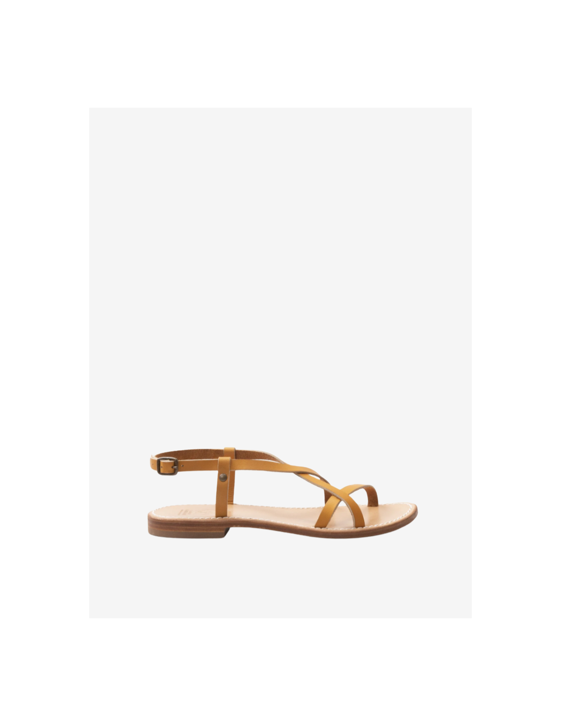 Brides croisées sur le coup de pied, attachées par une boucle sur l'arrière de la cheville.