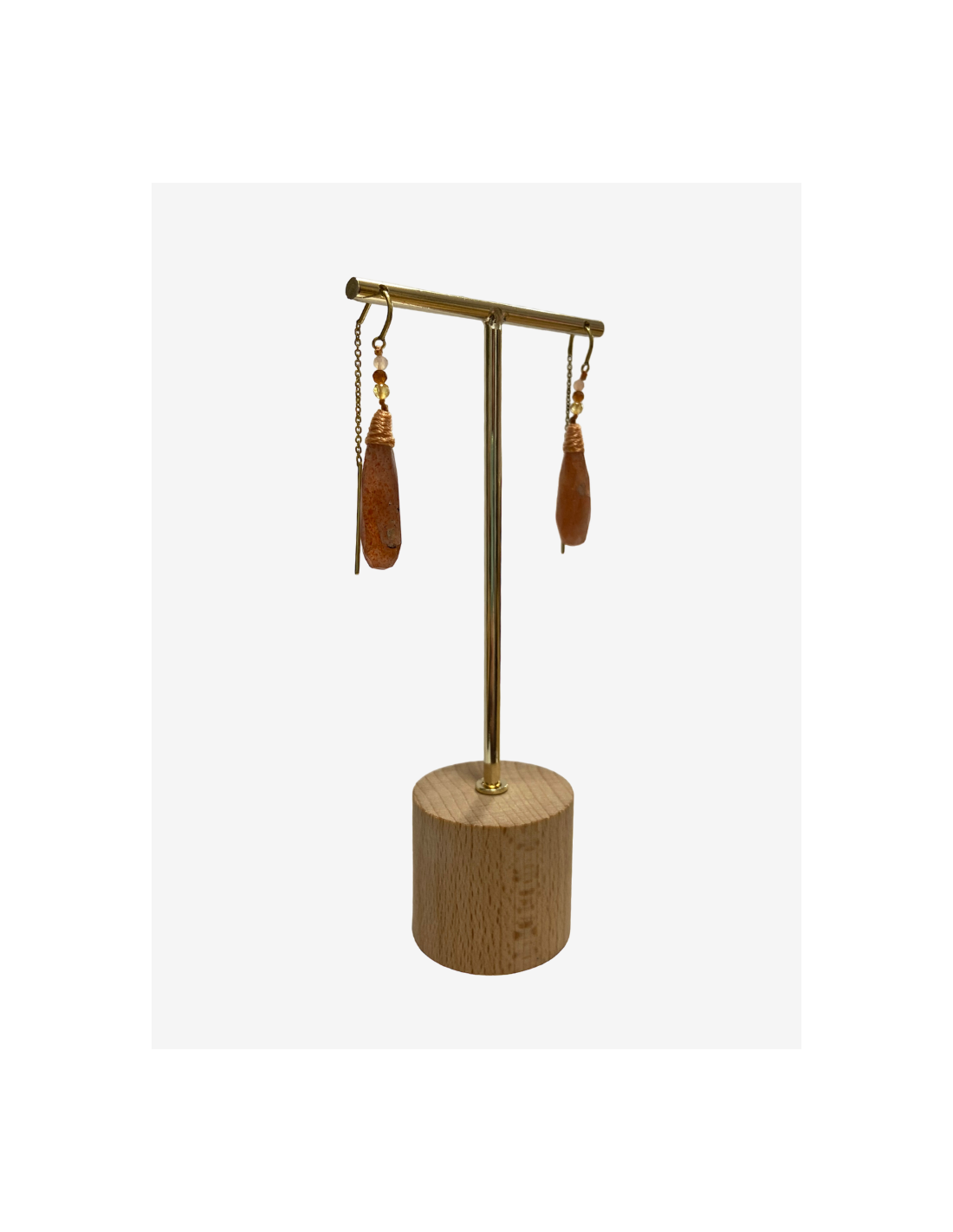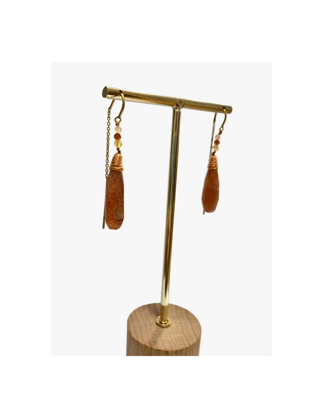 Boucles d’oreilles AJA IFA en pierres fines et fils de soie composées de plusieurs pierres :pierre de lune pêche, spessartite et citrine montés sur des fils de couleur nude. Les pendants en forme de goutte sont en pierre de soleil. Tous nos bijoux sont montés et noués à la main dans nos ateliers en Inde. Nos pièces sont uniques, des différences de taille ou de couleur peuvent apparaître parfois. Nos créations n’aiment ni les eaux salées, ni les eaux chlorées.