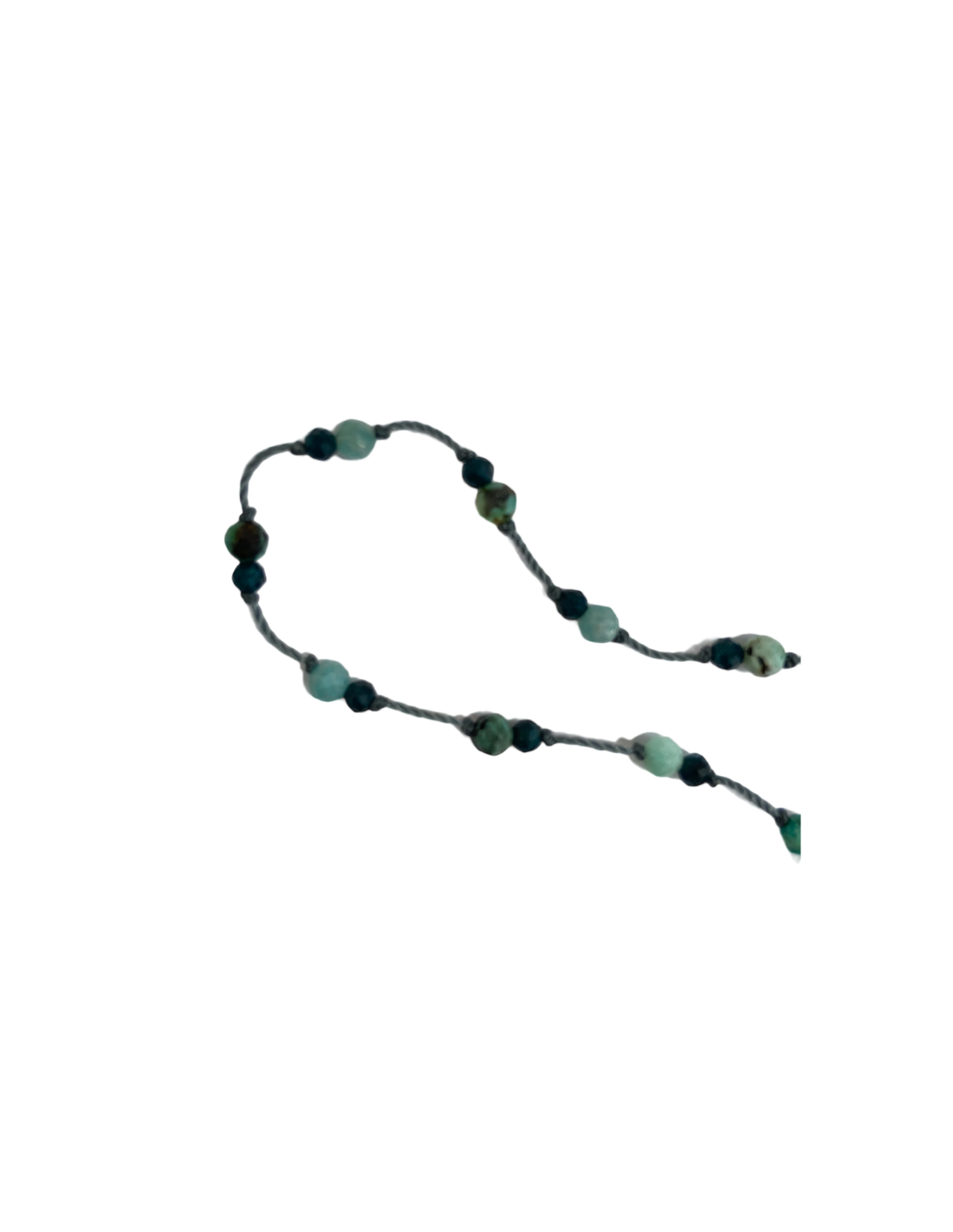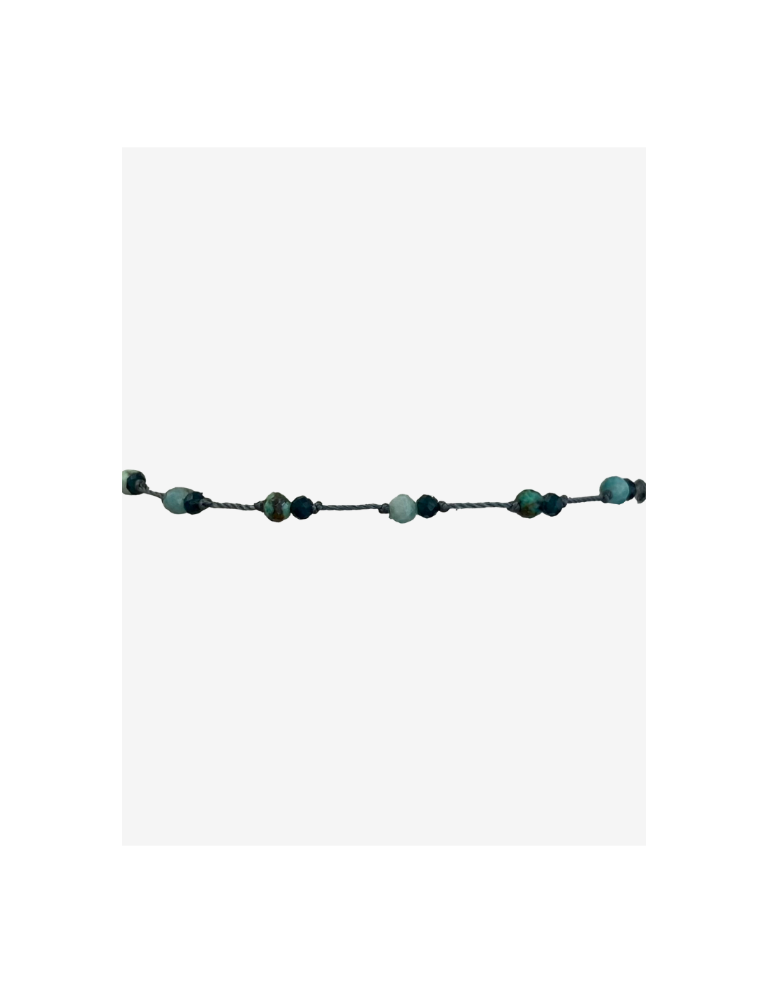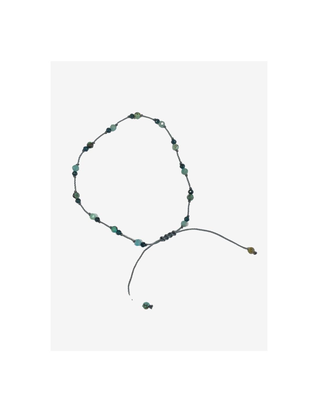 Les bracelets JANE sont montés à la main sur fils de soie et nylon mélangés couleur pétrole. Ils sont composés de différentes pierres : amazonite, turquoise et zircon Ils sont ajustable de 14 à 20 cm.