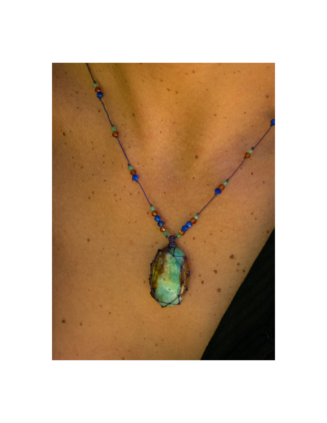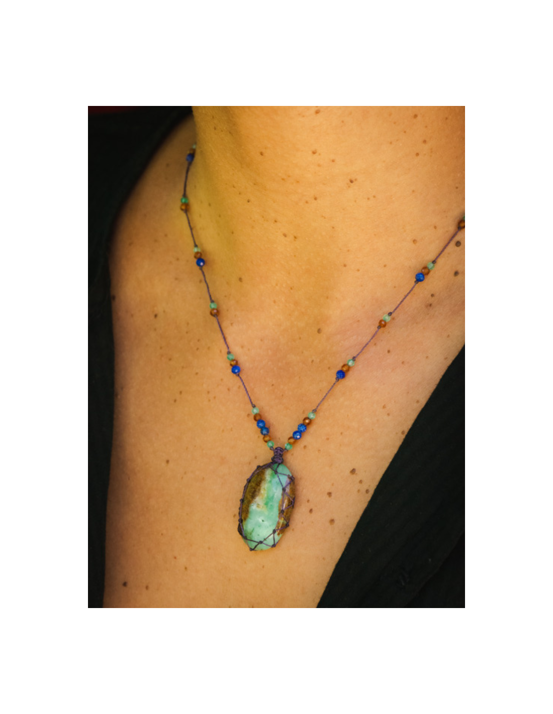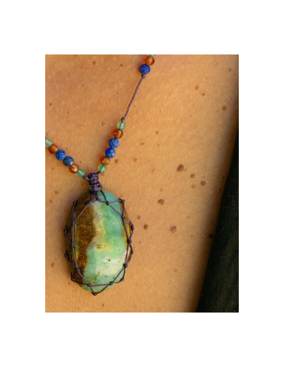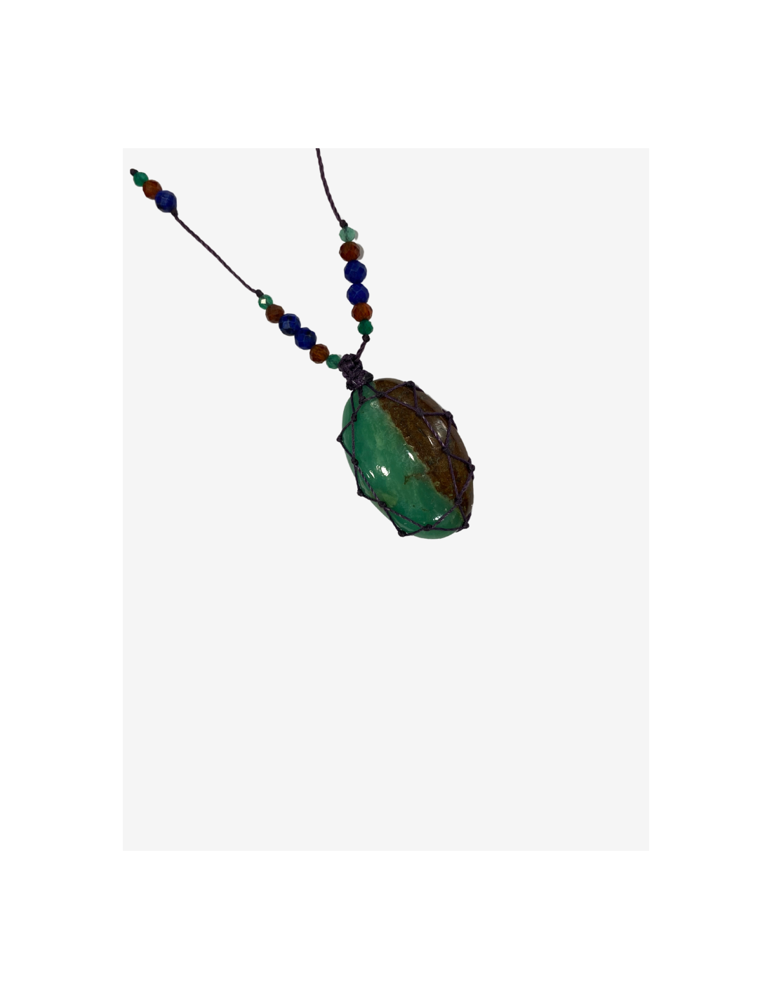Le talisman est orné d’un cabochon de chrysoprase. Il est ajustable de 20 à 35 cm grâce à son fermoir coulissant.