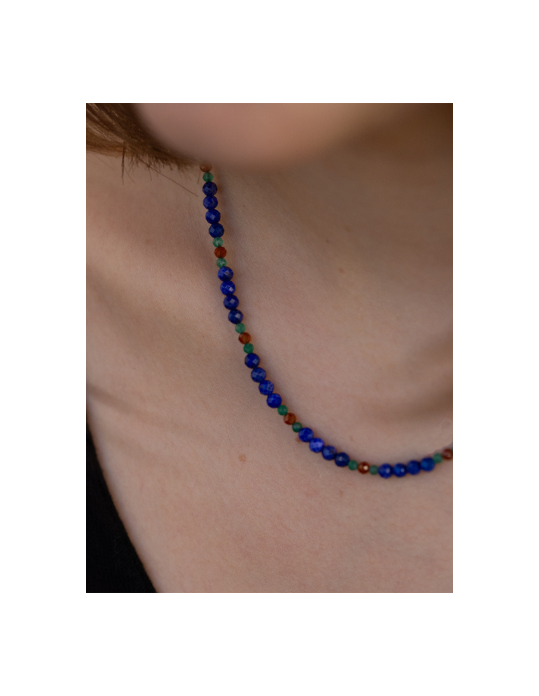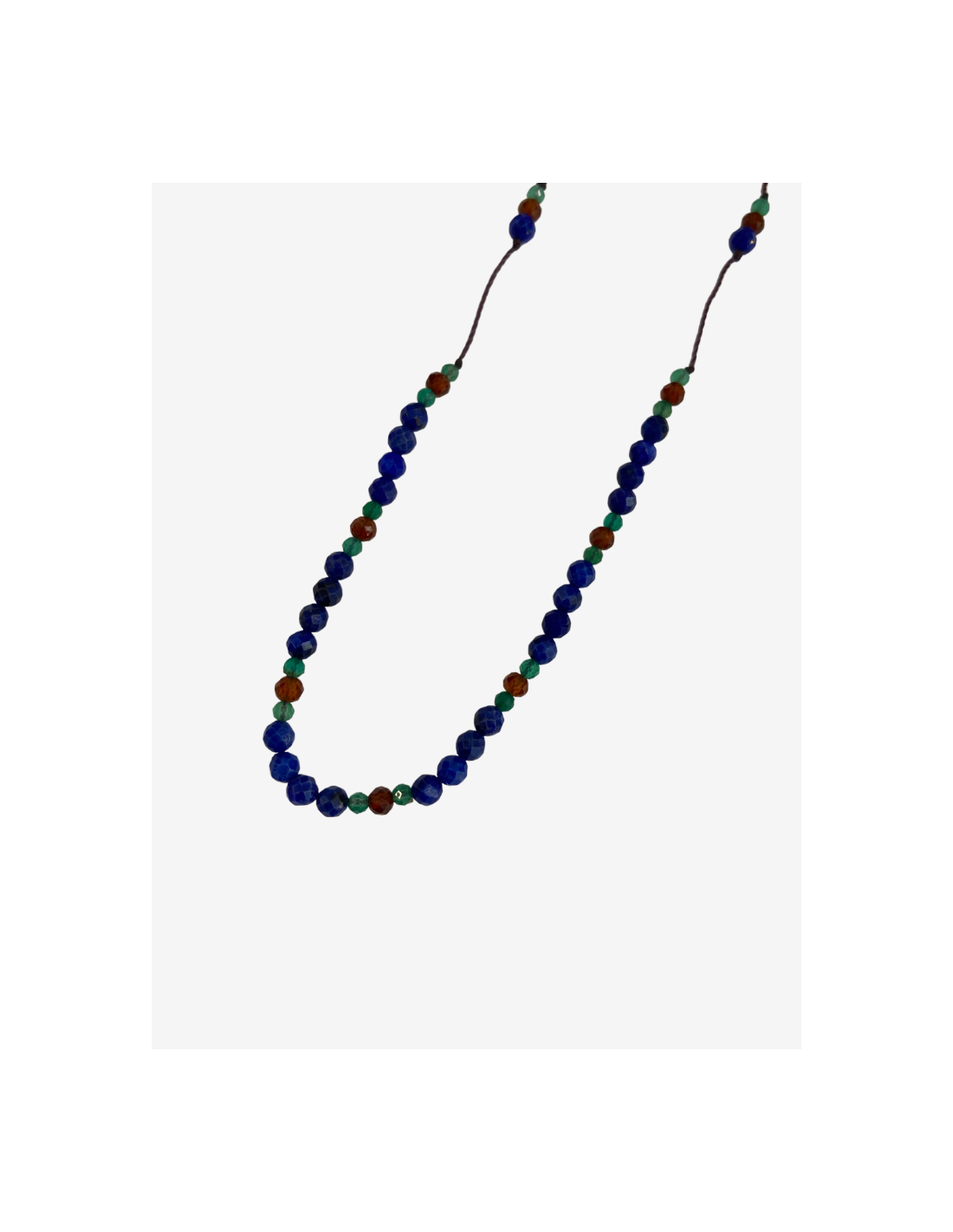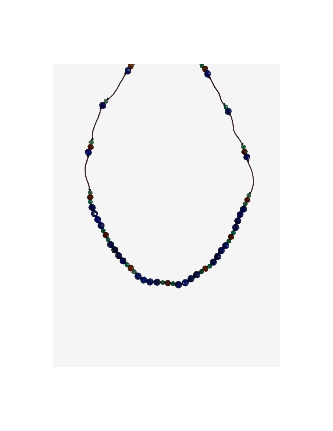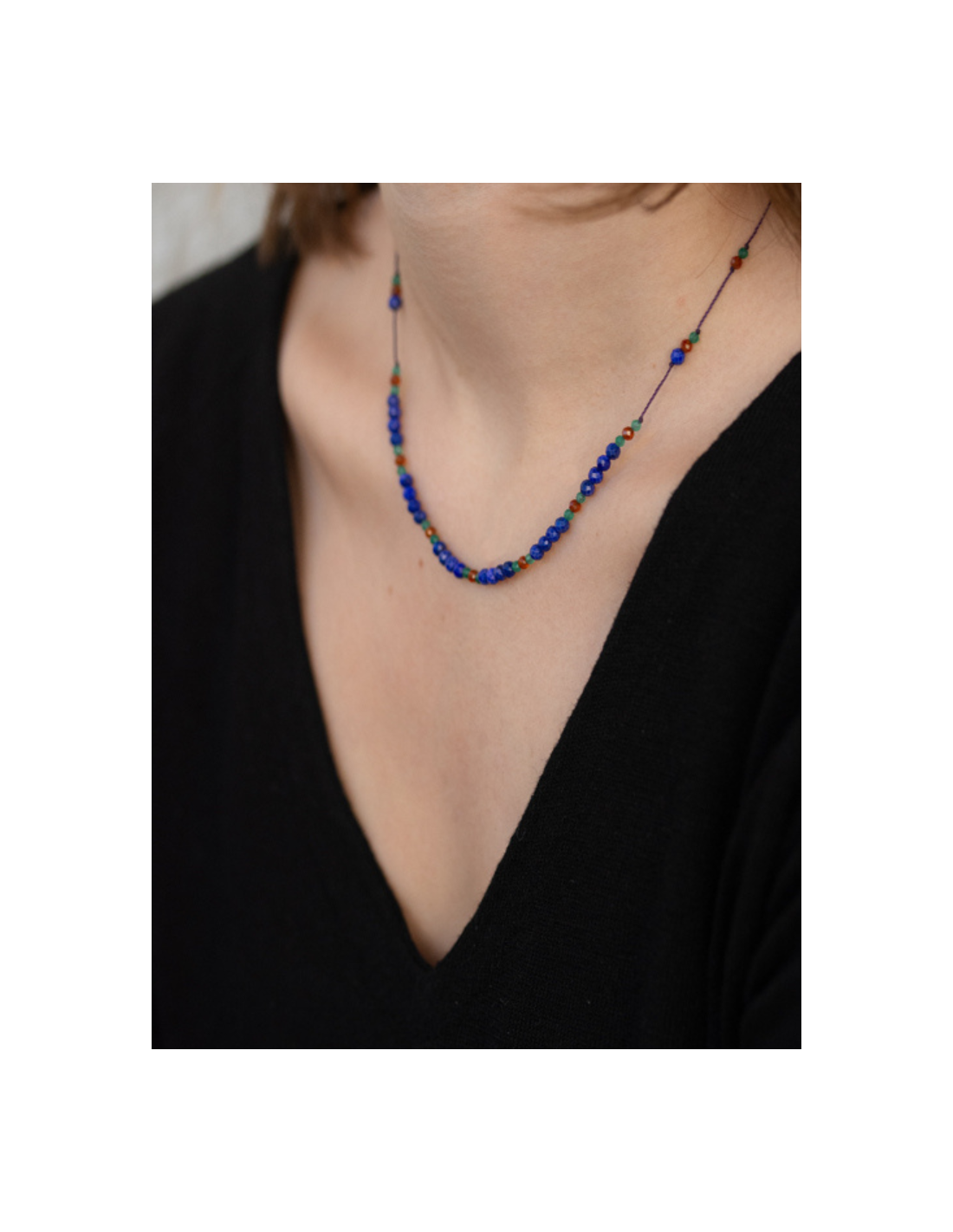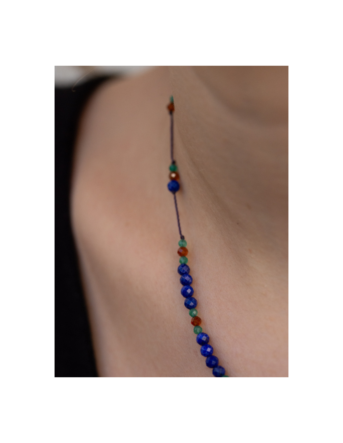 Le collier Line GUSS est composé de différentes pierres : lapis lazuli, spessartite et onyx vert sur des fils de couleur cassis.