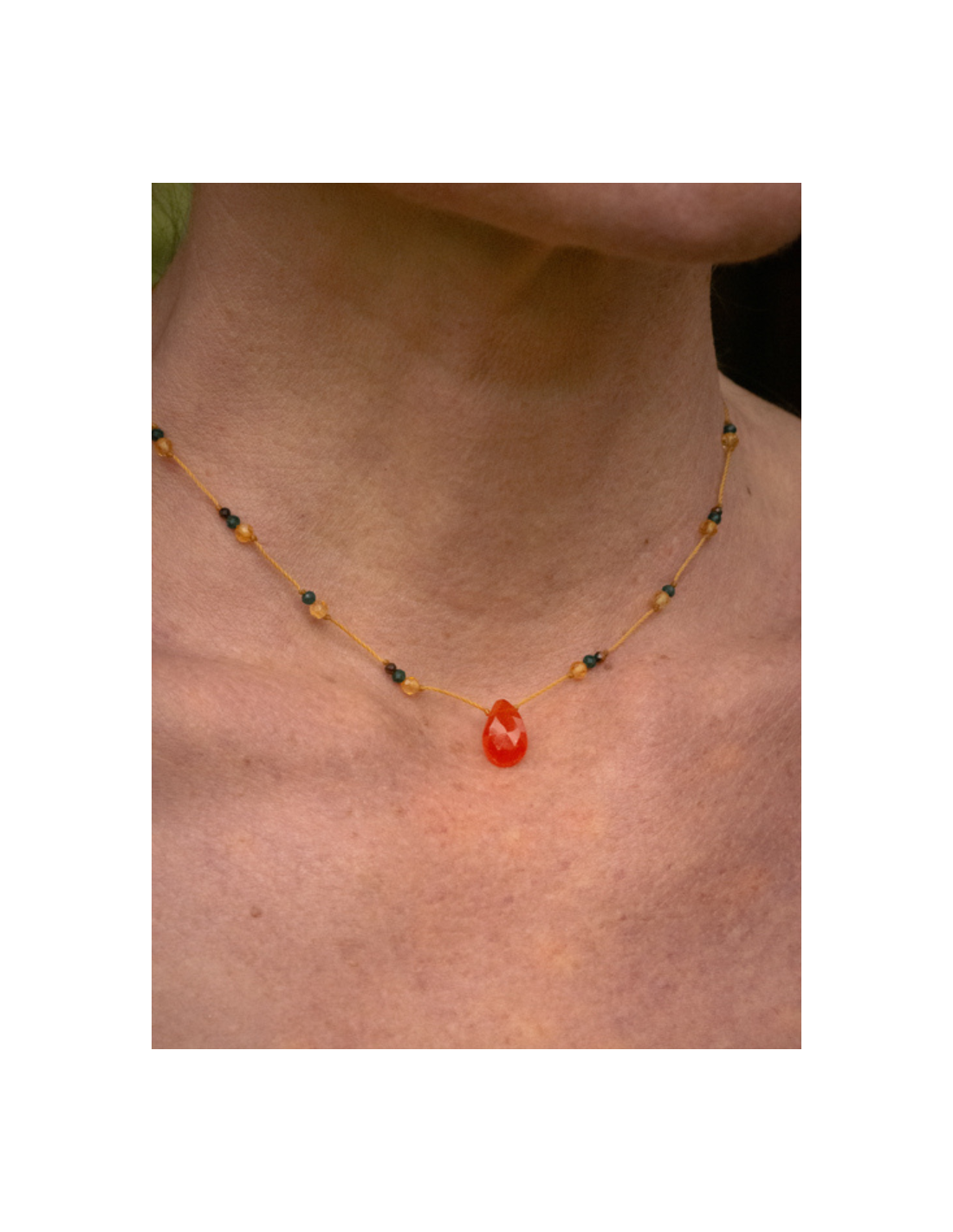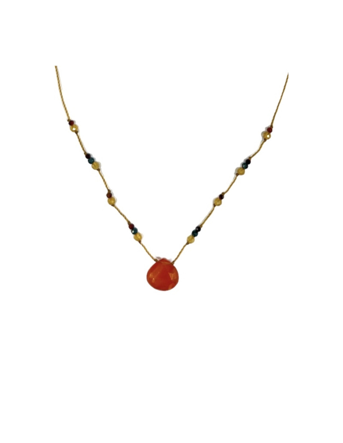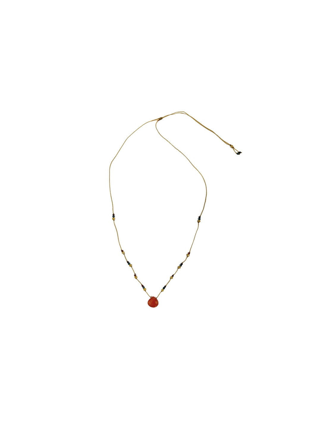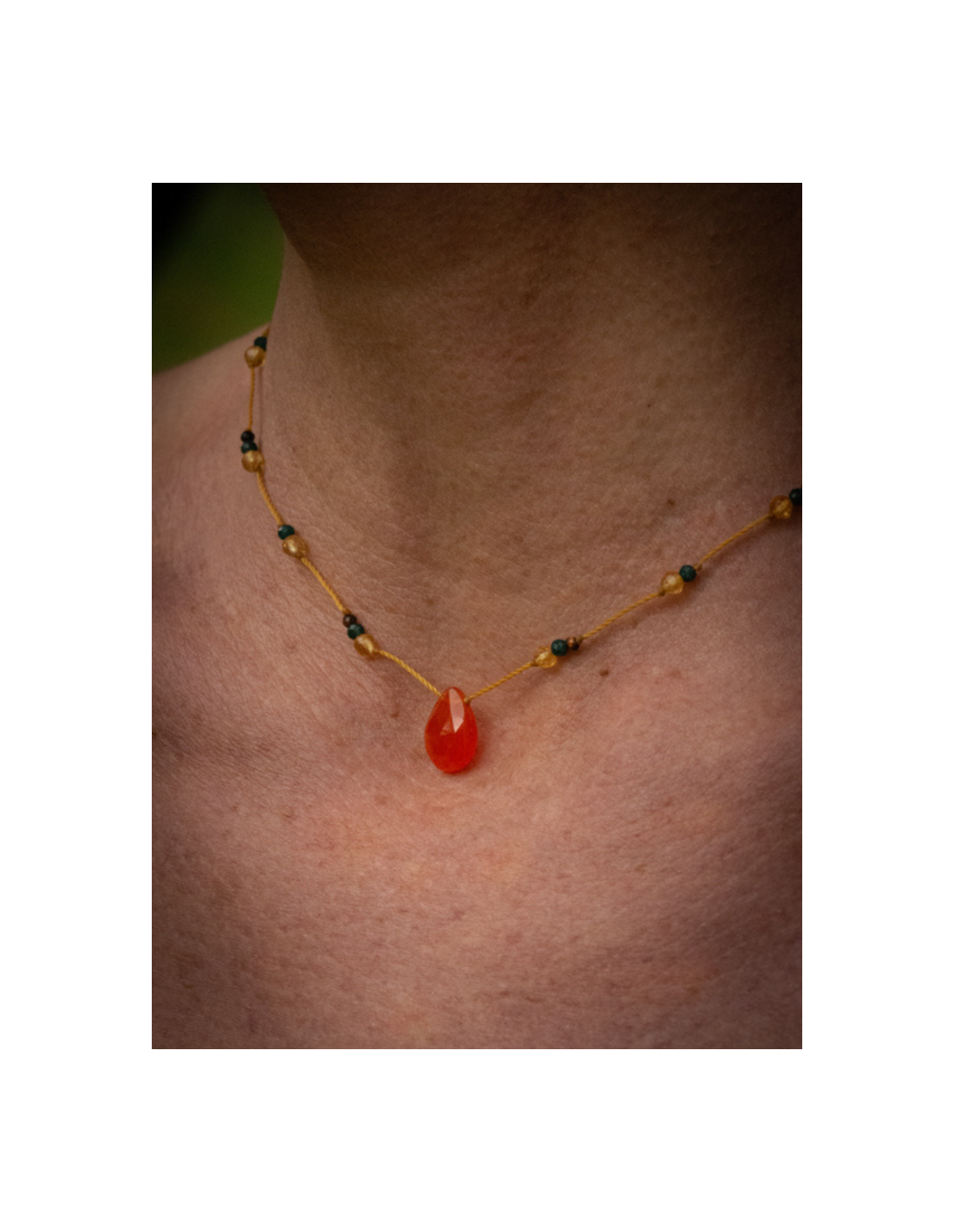 Collier ajustable orné d’une délicate goutte facettée de cornaline sur fils de couleur safran.