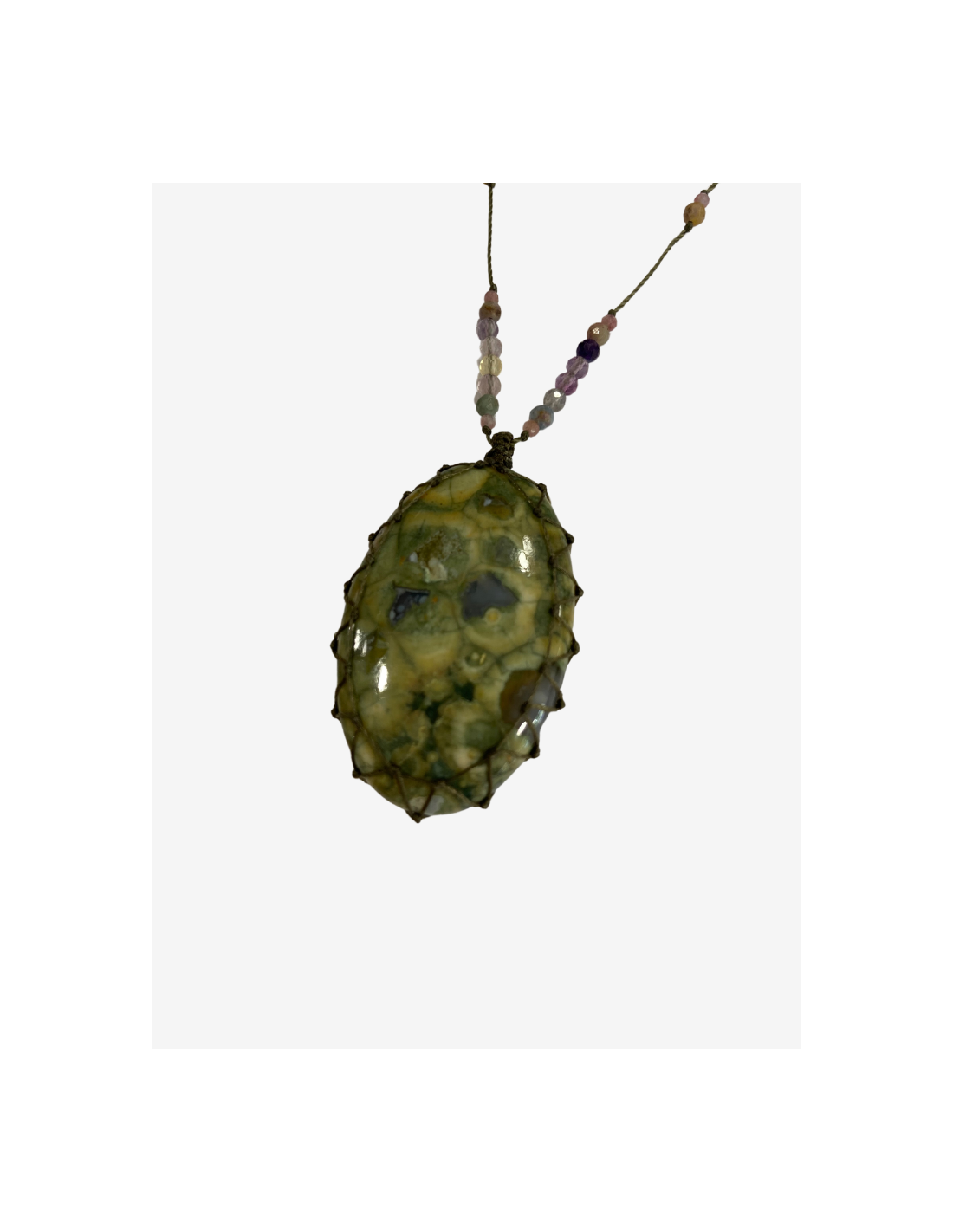 Le grand talisman RAPH est composé de plusieurs pierres : saphirs multicolores, quartz fumé et tourmaline rose montés sur des fils de couleur kaki.
