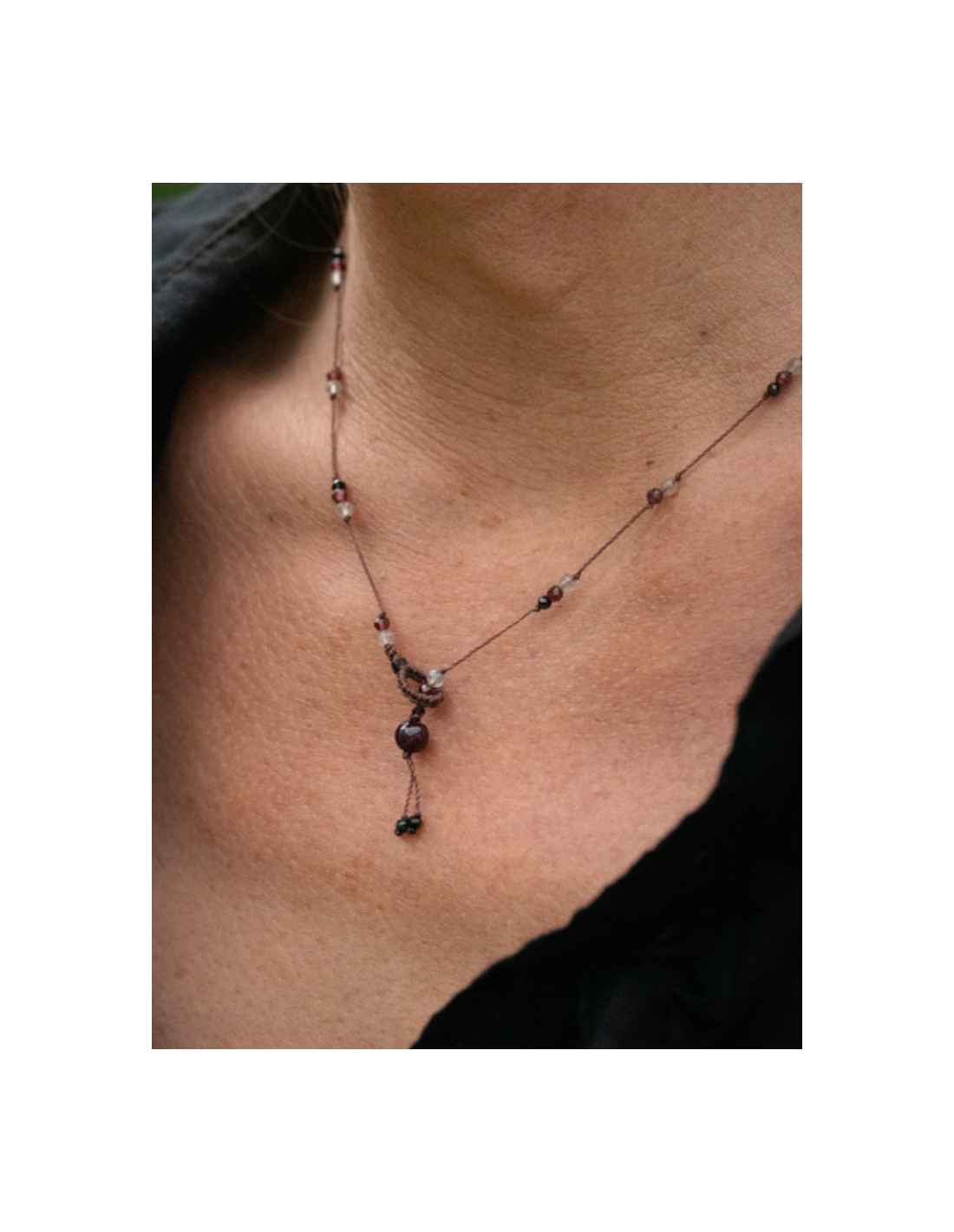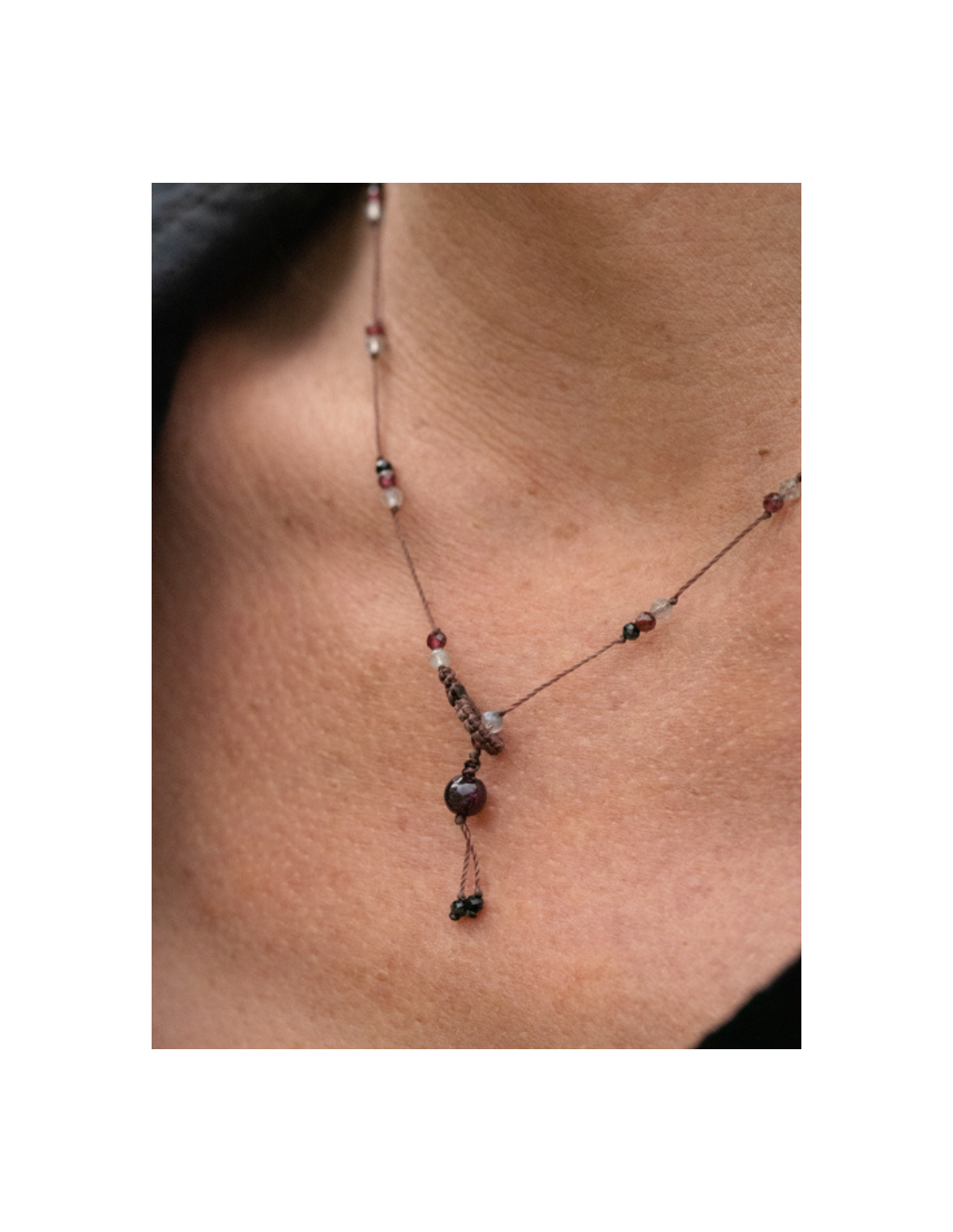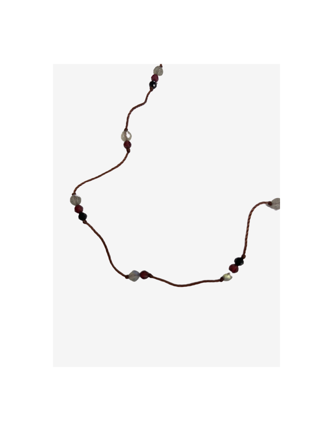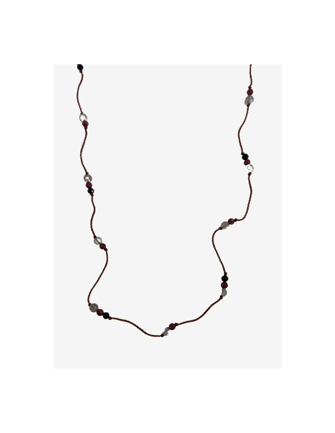 Le collier ras de cou LAZ est en pierres fines et fils de soie. Il est composé de différentes pierres : grenat, onyx noir et labradorite sur des fils de couleur grenat. Sa longueur est de 46 cm.