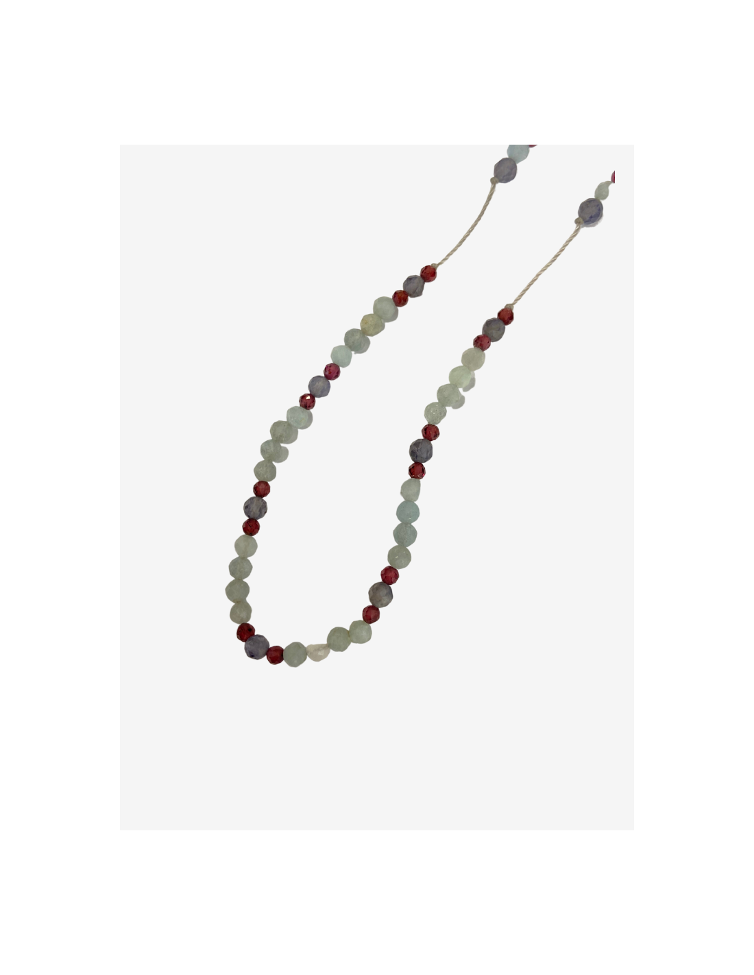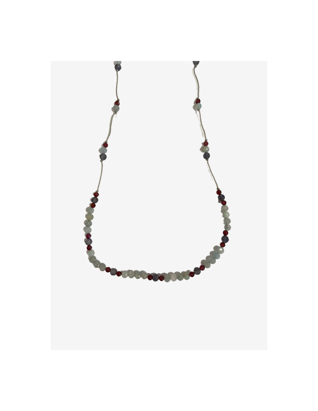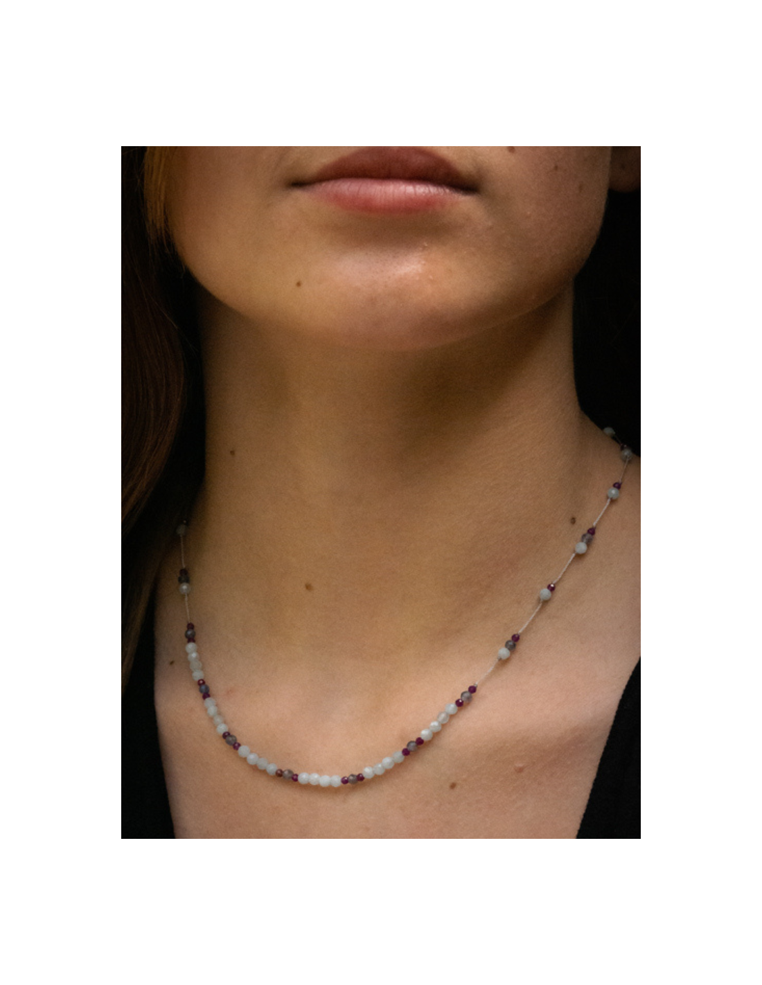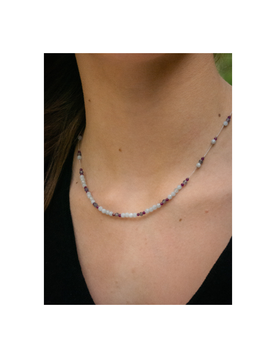 Le collier Line LUCIE est composé de différentes pierres : calcédoine, iolite et zircon violet sur des fils de couleur gris perle.