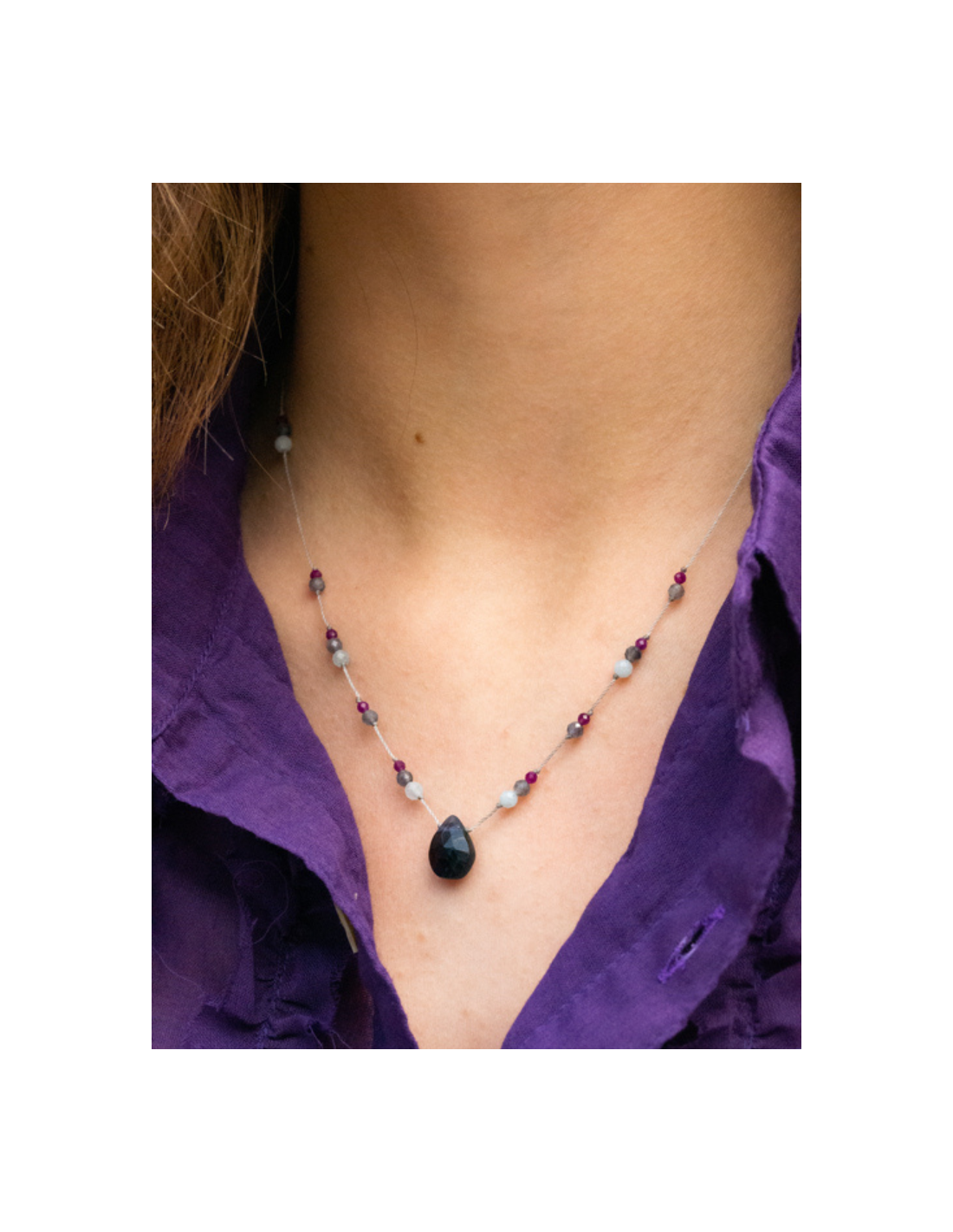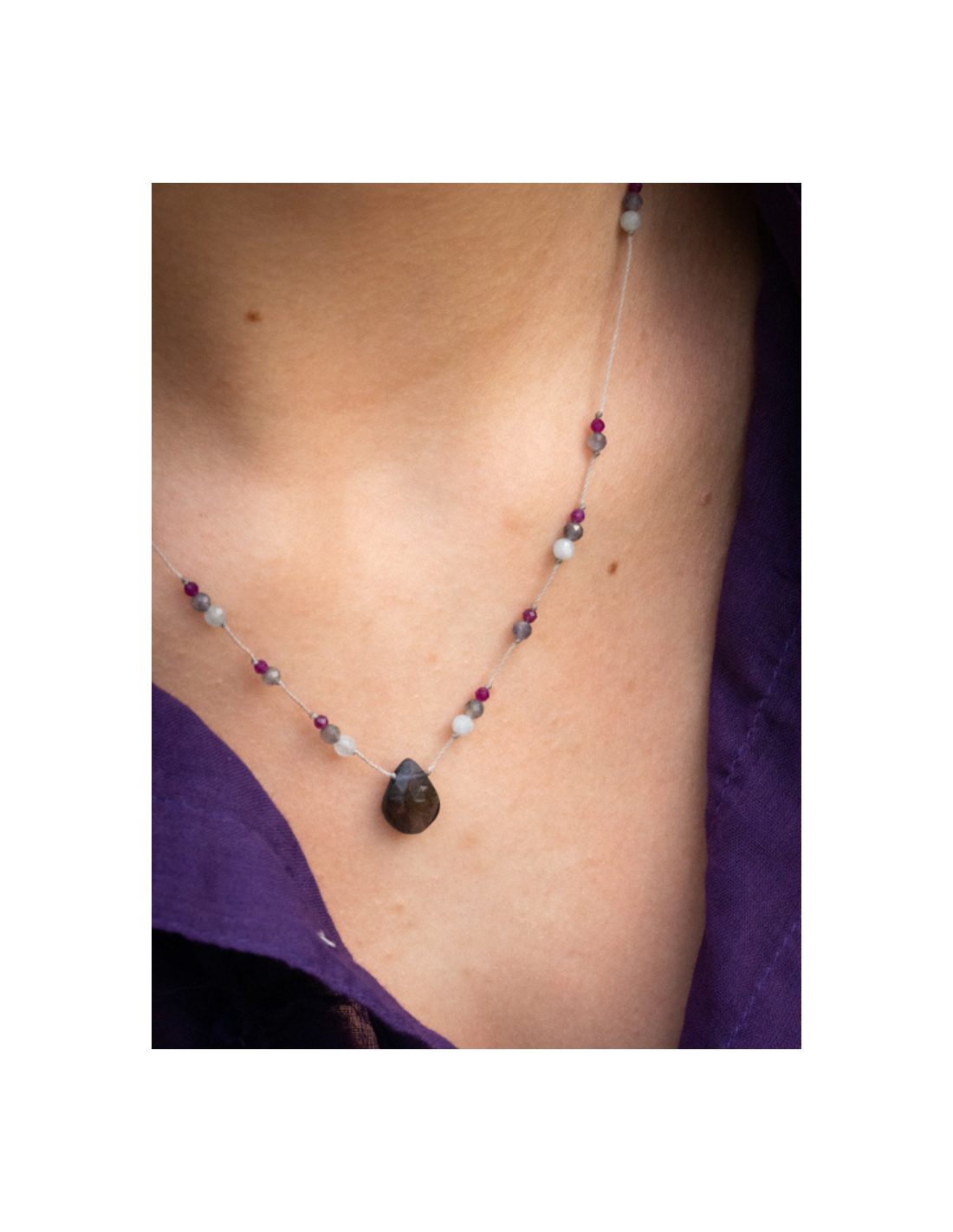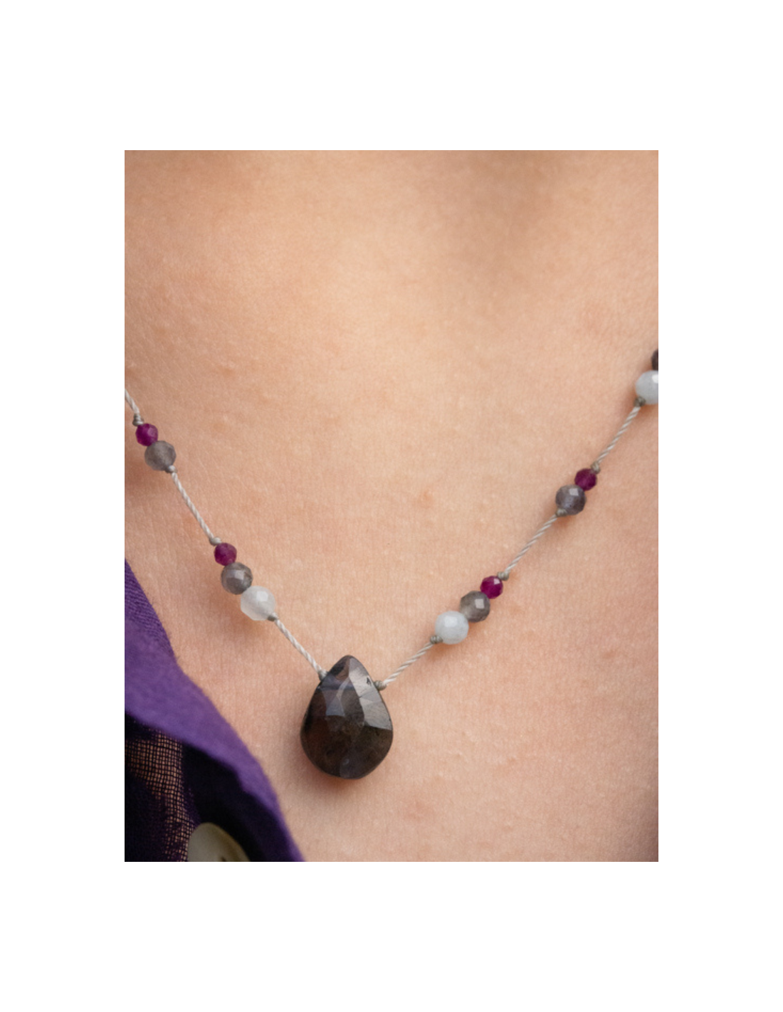 Collier ajustable orné d’une délicate goutte facettée d’iolite sur fils de couleur perle.