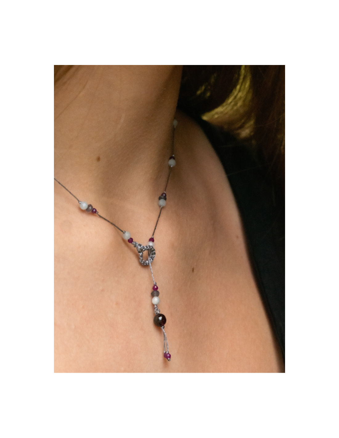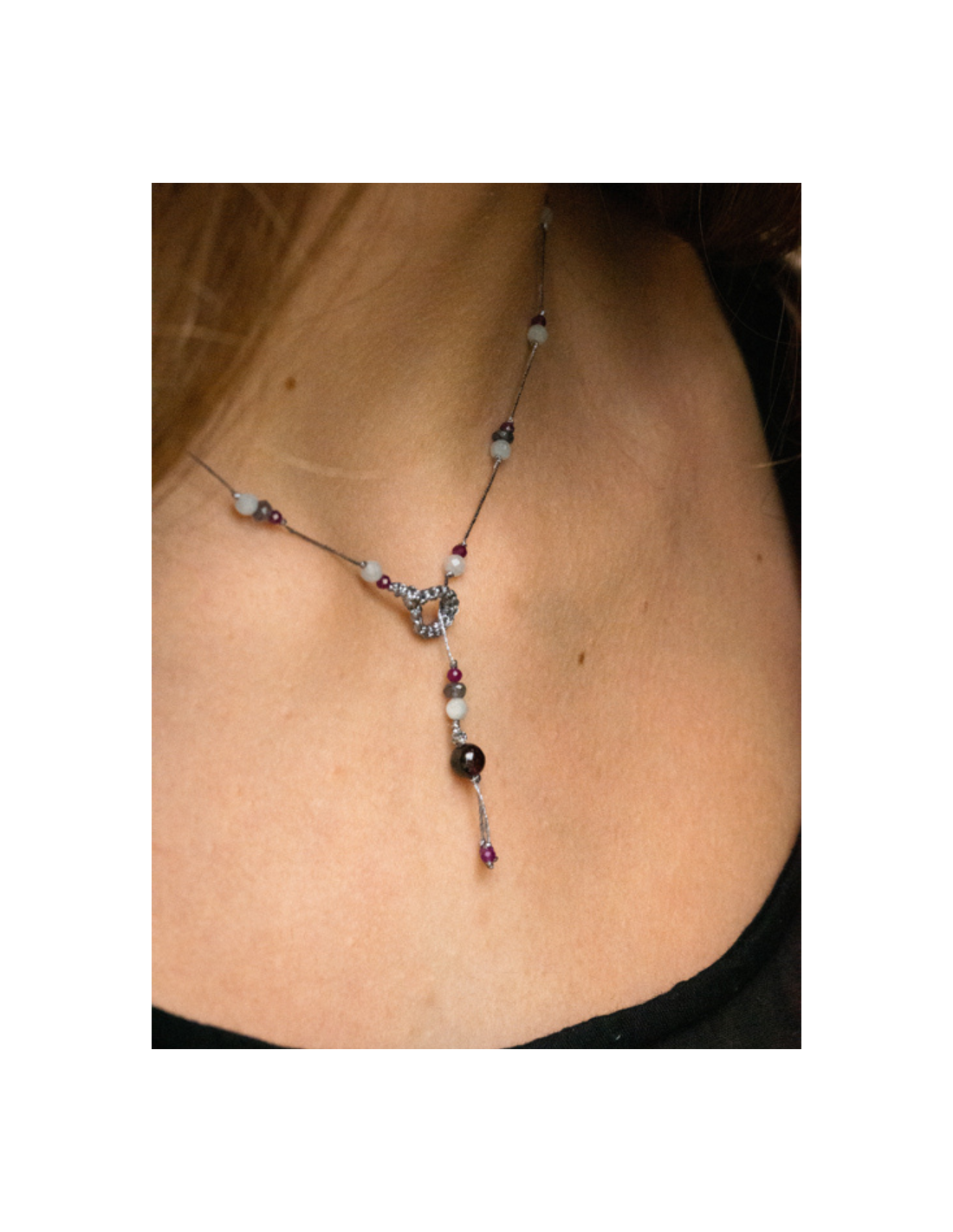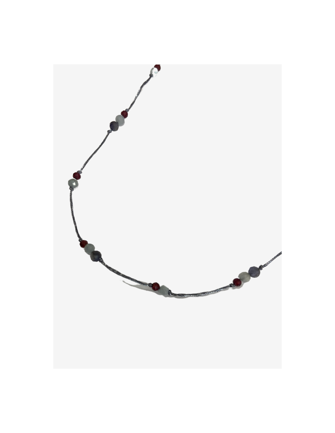 Le collier ras de cou LUCIE est en pierres fines. Il est composé de différentes pierres : calcédoine, iolite et zircon violet sur des fils métallisés de couleur argent. Sa longueur est de 46 cm.