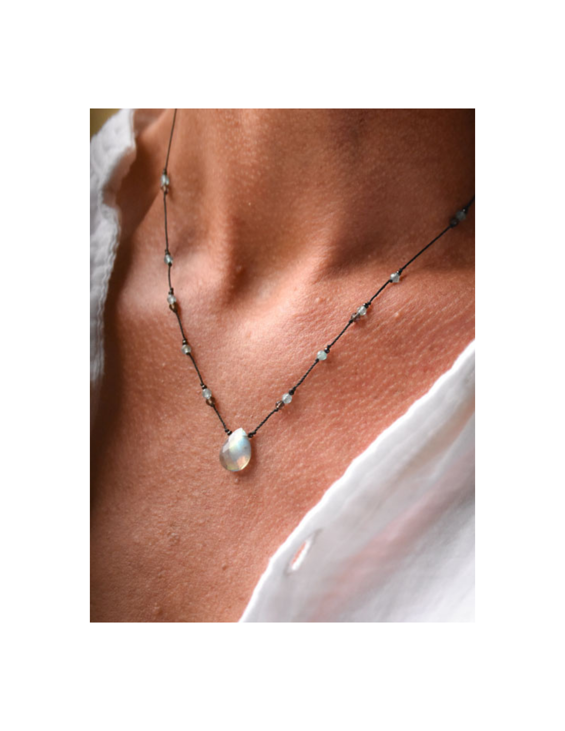 Collier ajustable orné d’une délicate goutte facettée de labradorite.