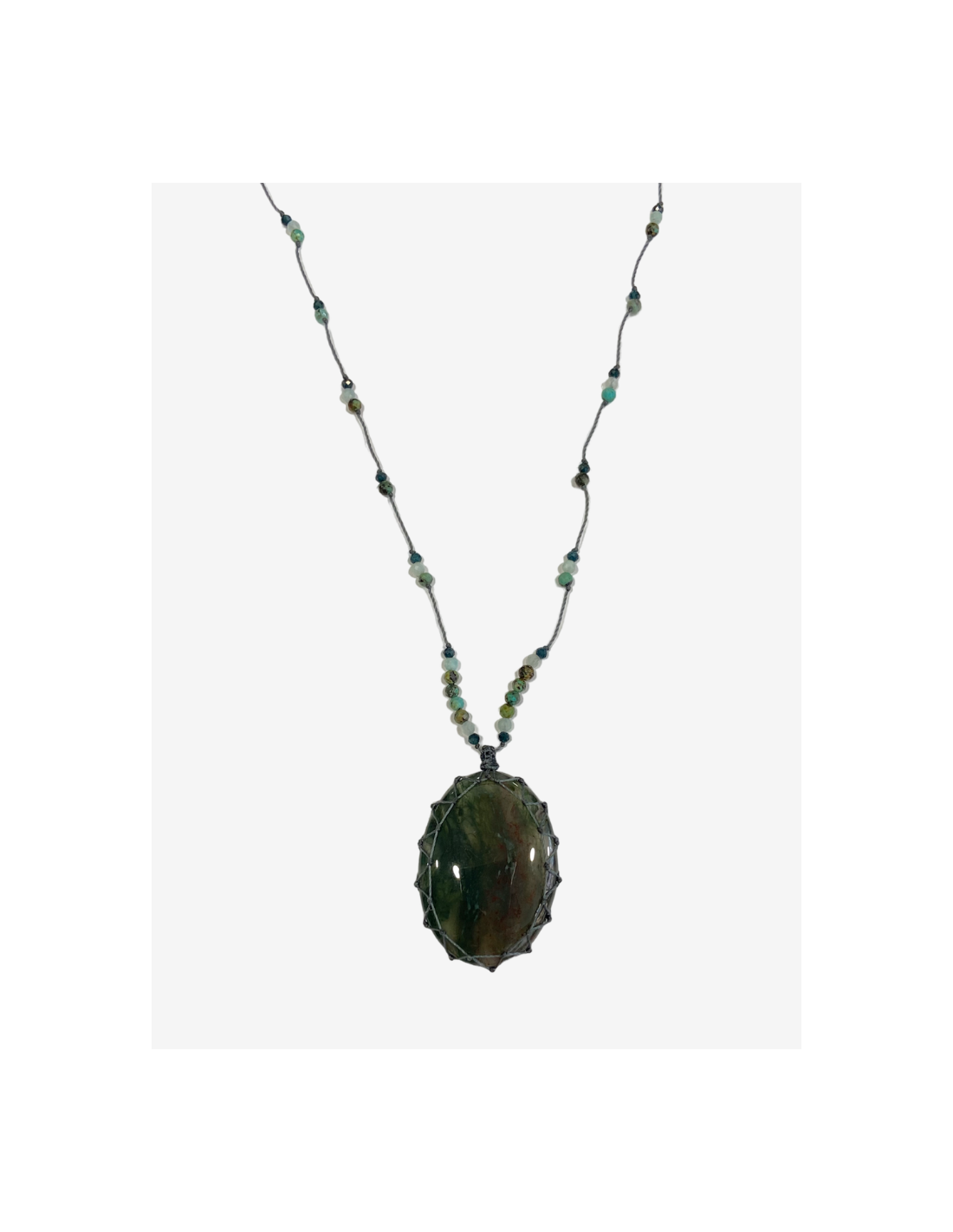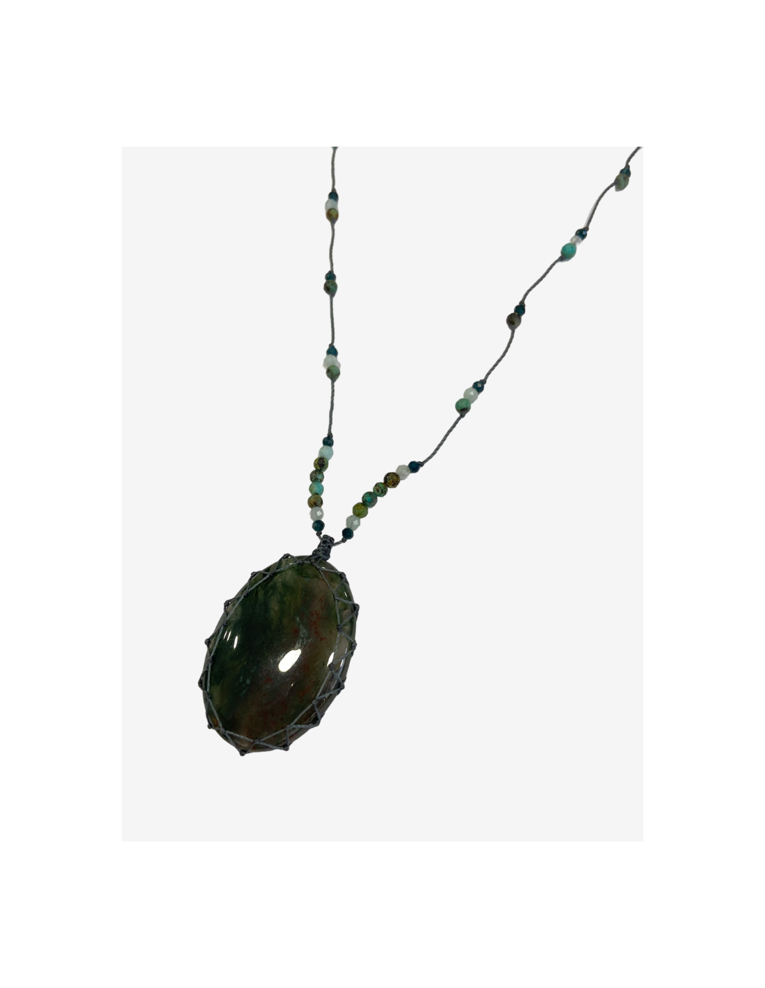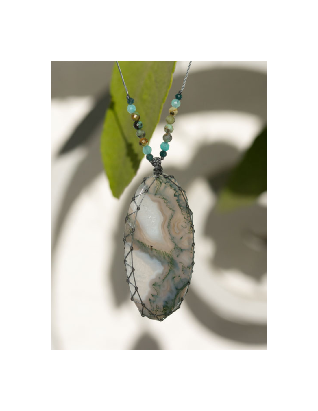 Le talisman est orné d’un cabochon d’agate mousse. Il est ajustable de 35 à 52 cm grâce à son fermoir coulissant.