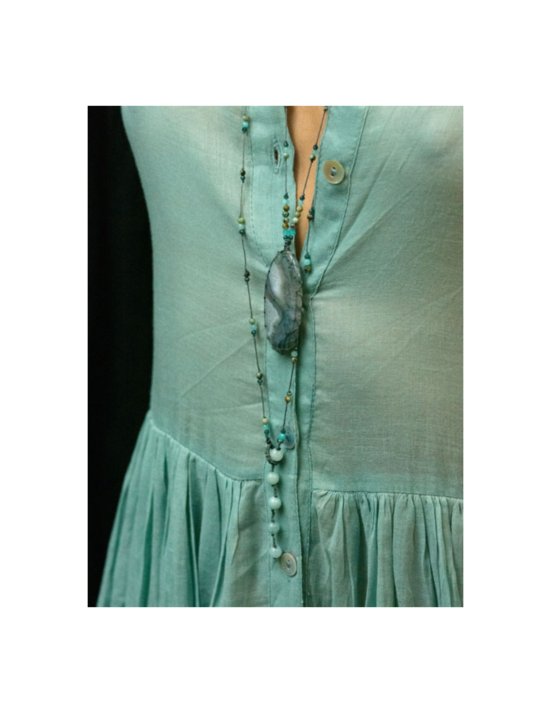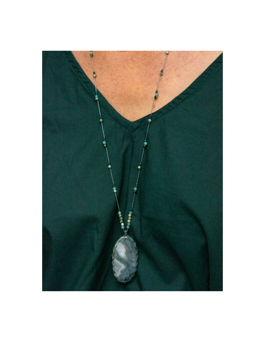 Le grand talisman JANE est composé de plusieurs pierres : turquoise, amazonite et zircon montés sur des fils de couleur pétrole.