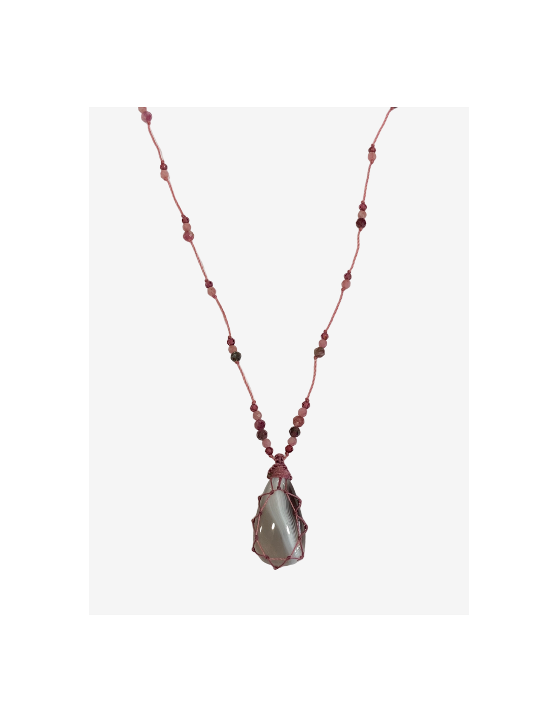 Le petit talisman ROMI est composé de plusieurs pierres : grenat, tourmaline rose et rubis montés sur des fils de couleur framboise.