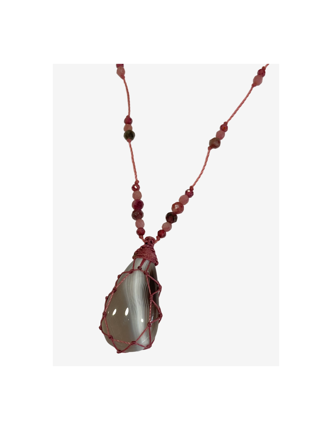 Le talisman est orné d’un cabochon d’agate grise. Il est ajustable de 20 à 35 cm grâce à son fermoir coulissant.
